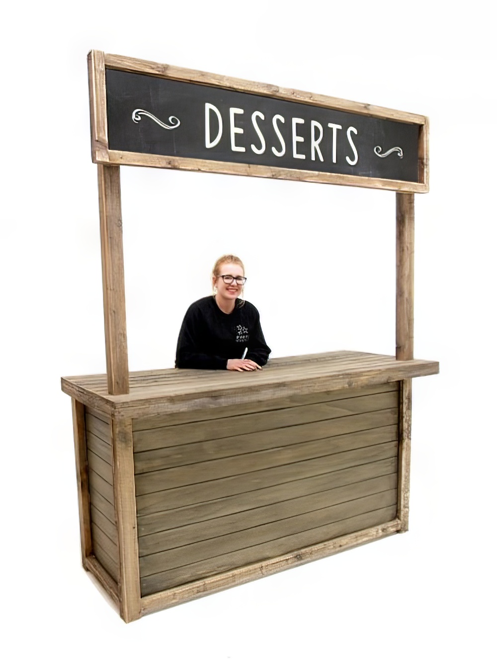 Desserts Food Stall to hire. This is a fabulous rustic looking food stall; perfect for any themed event. You can even choose whether you want the uprights and top sign positioned at the front or rear of the stall; simply set it up on site as you wish!