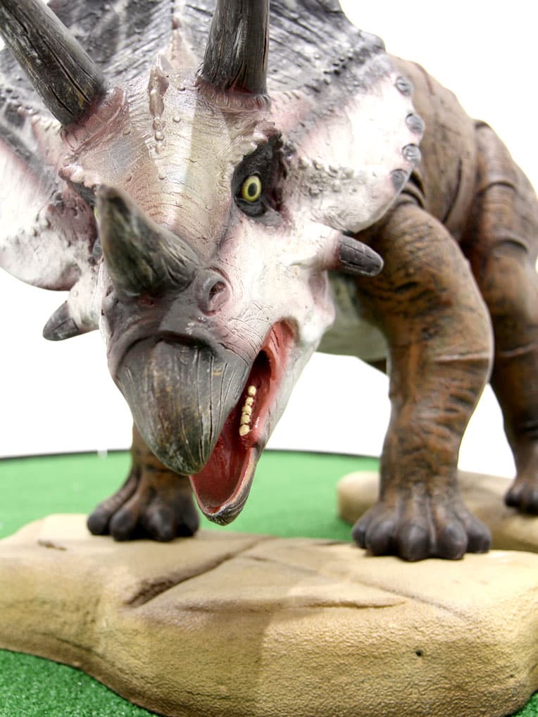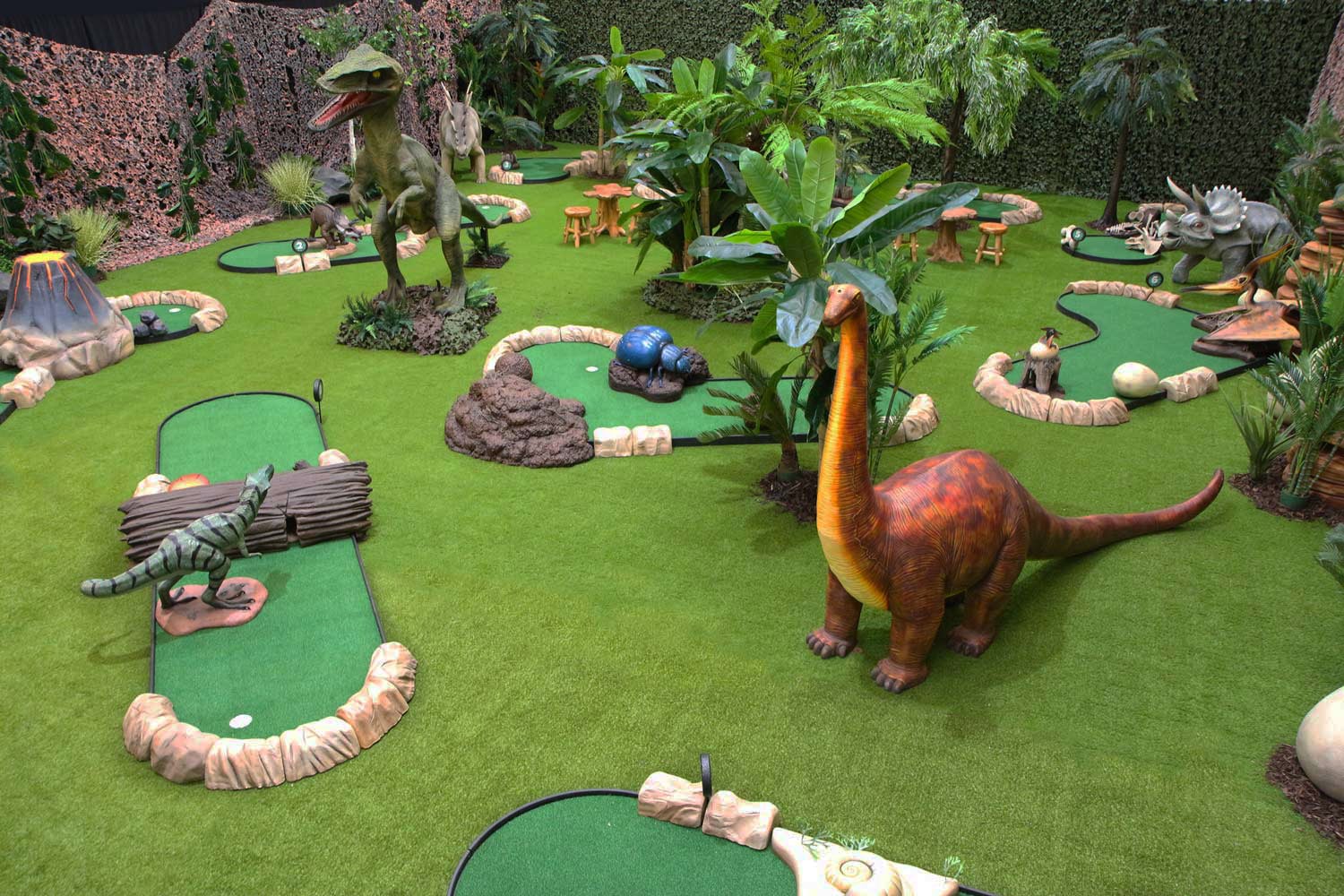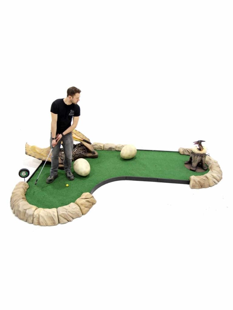 Dinosaur Golf Course – HOLE B – Triceratops Tunnel for hire. This is the perfect pop up for visitor attractions, venues, shopping outlets or town centres. Using these fantastic themed holes we can work with you to create a floorplan and design a layout that works for the area you are looking to host the Adventure Golf. We have additional elements that can complete the look including larger dinosaurs, ticket office and fencing perimeter. Our Adventure Golf would also be a great addition to a Children ย’s Birthday, Corporate Team Building Event or Wedding, with the option to take a reduced amount of holes. (Please note Dino Land Adventure Golf holes can be rented individually but there is a minimum order of 3 holes).