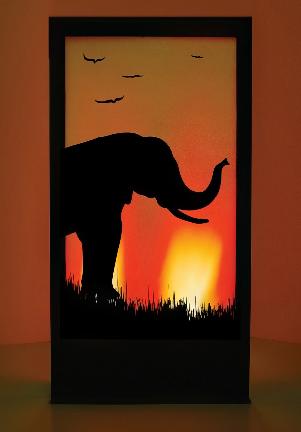African Elephant Sihouette Panel to hire. Perfect for any African themed event party. Actual lighting colour supplied may vary from that shown.