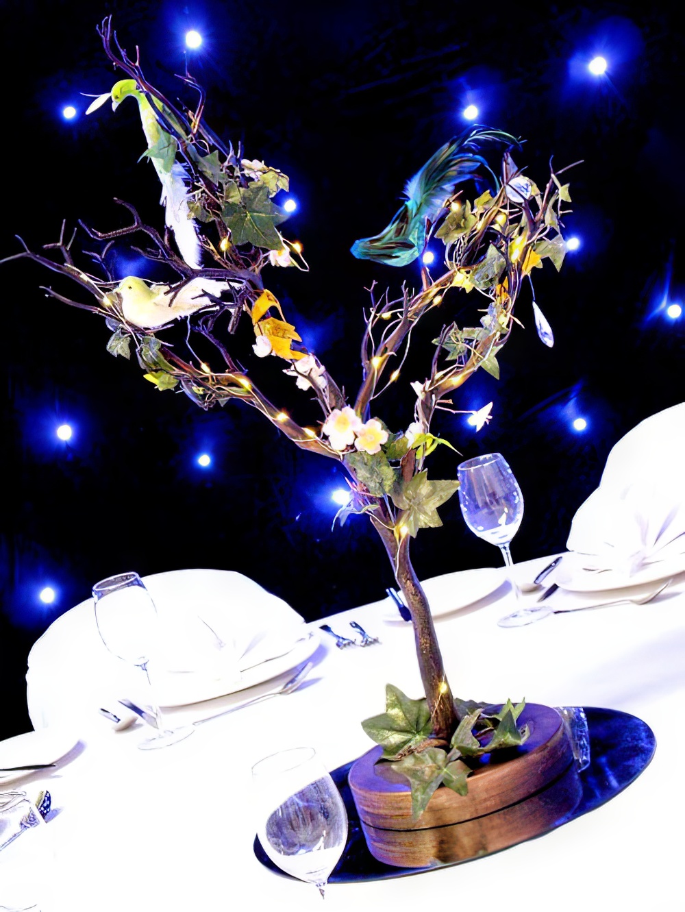 Enchanted Table Centre to hire. This is a beautiful table centre ย that would look really pretty at any English Country Garden, Fairytale or Enchanted Forest themed party or event, or as table centres for your wedding breakfast. The table centre consists of a copper coloured twig tree, glittered ivy, blossom, crystal dew drops, small ornate birds and battery operated warm white floristry lights to create a visually stunning focal point for your table.