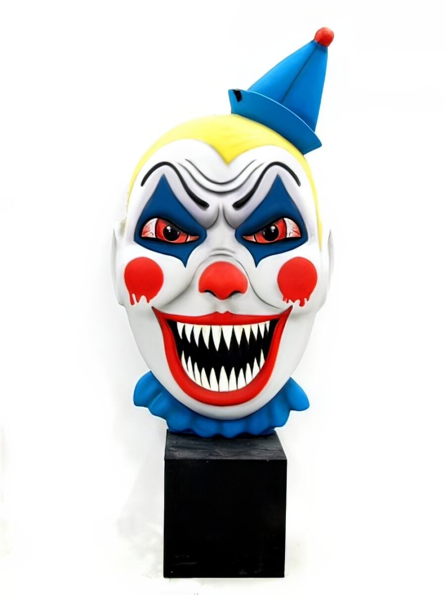Giant ย  EVIL Halloween Clown Head Circus prop to hire. These scary freestanding clown mask would be perfect for your Halloween themed event.