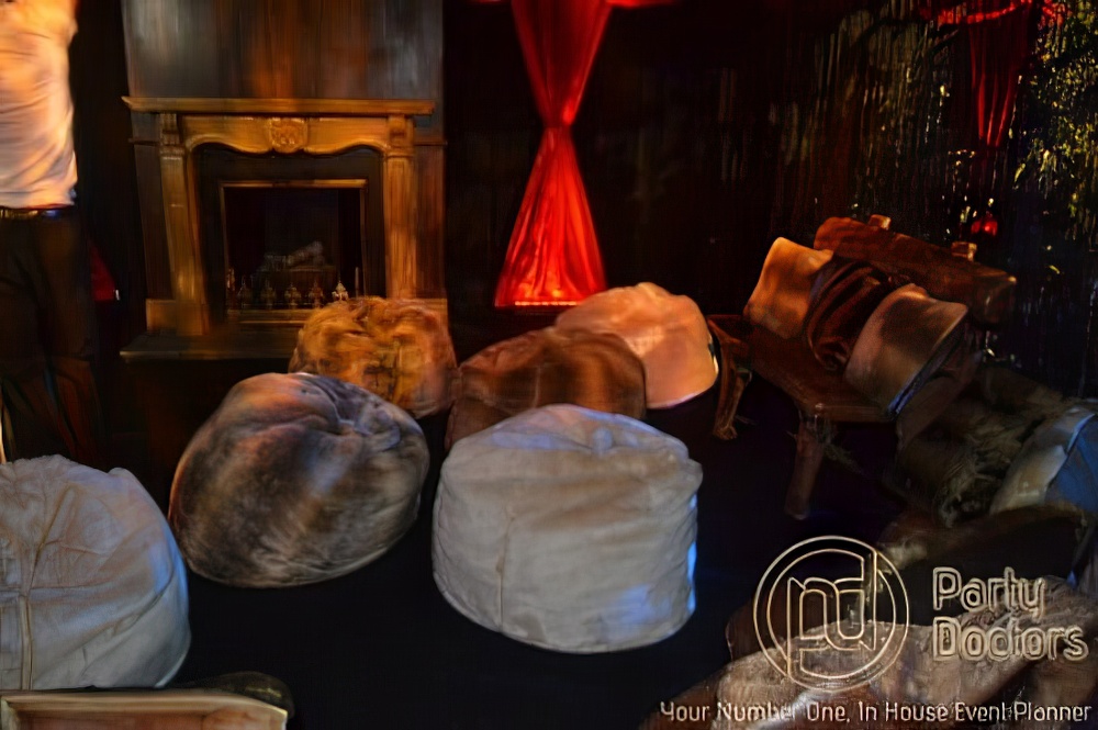 Cream ย Coloured Faux Fur Beanbag for hire. This quality faux fur beanbag would look great in so many of our themes, from Apres Ski or Rustic Christmas, through to Nightclub or Narnia, and artistically draped will complement our event furniture such as our brown Chesterfield range.