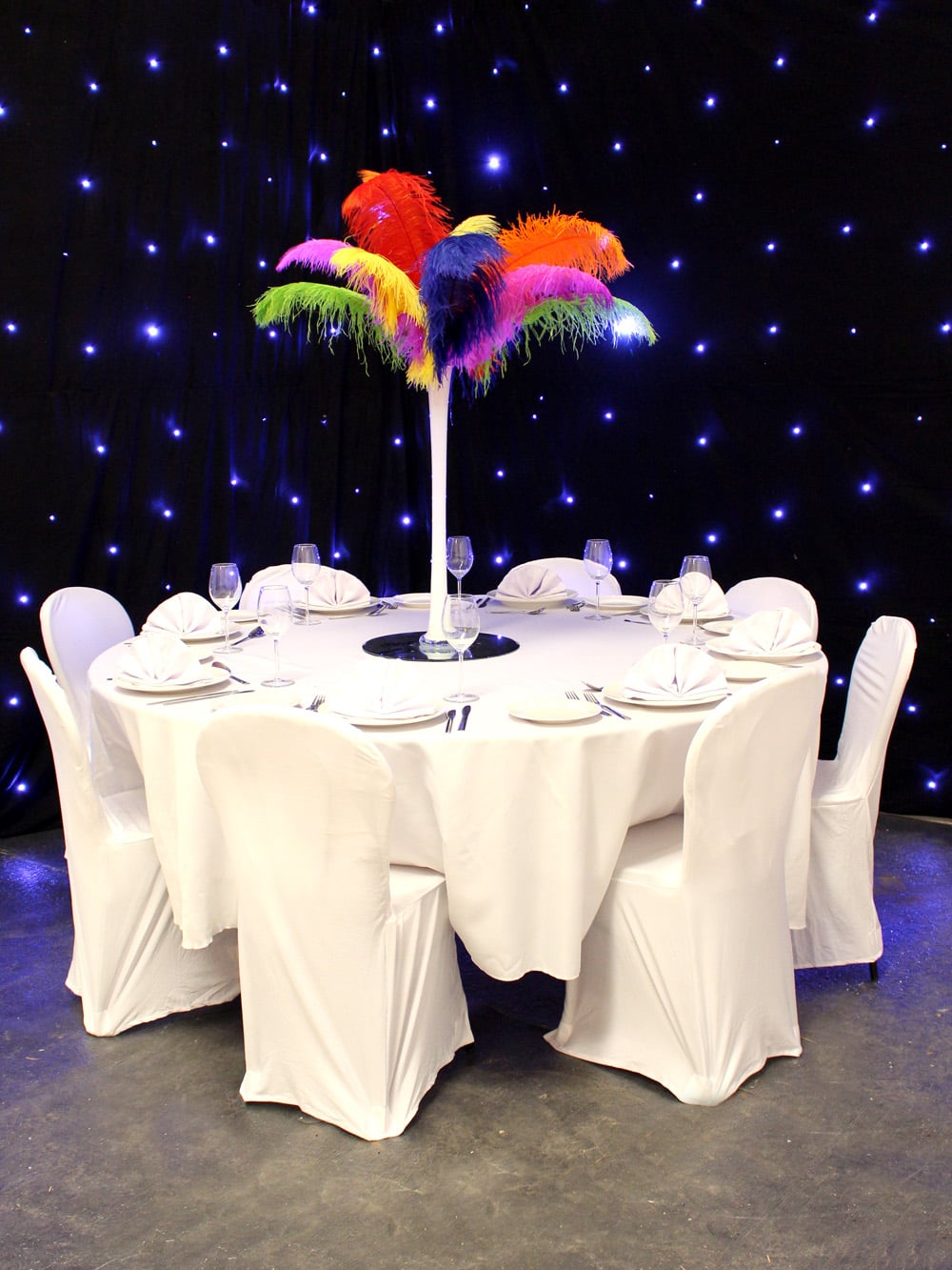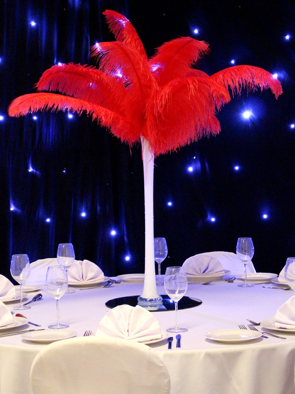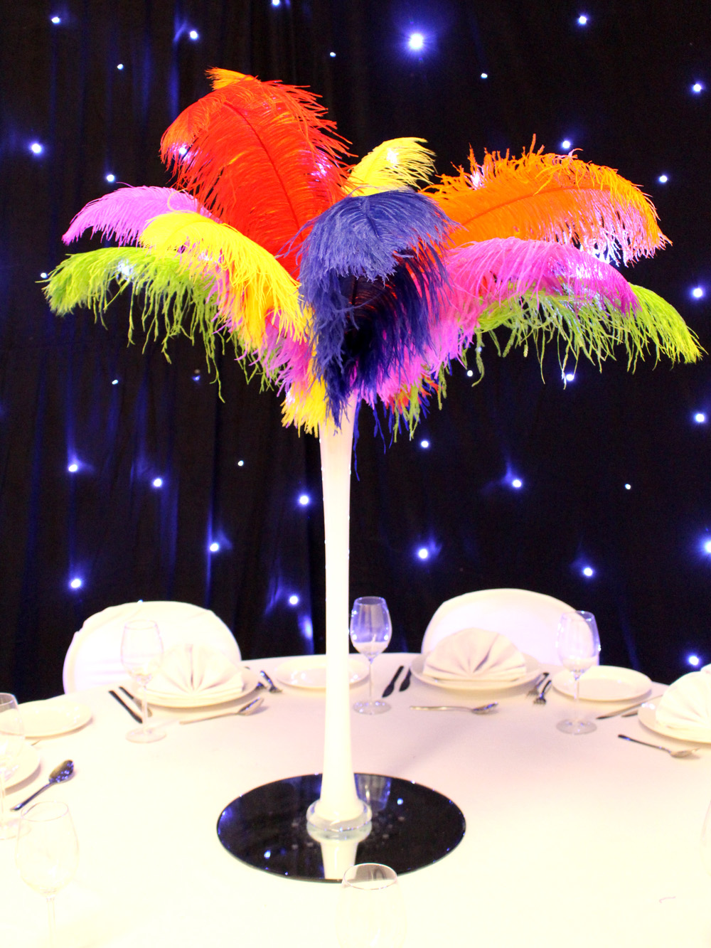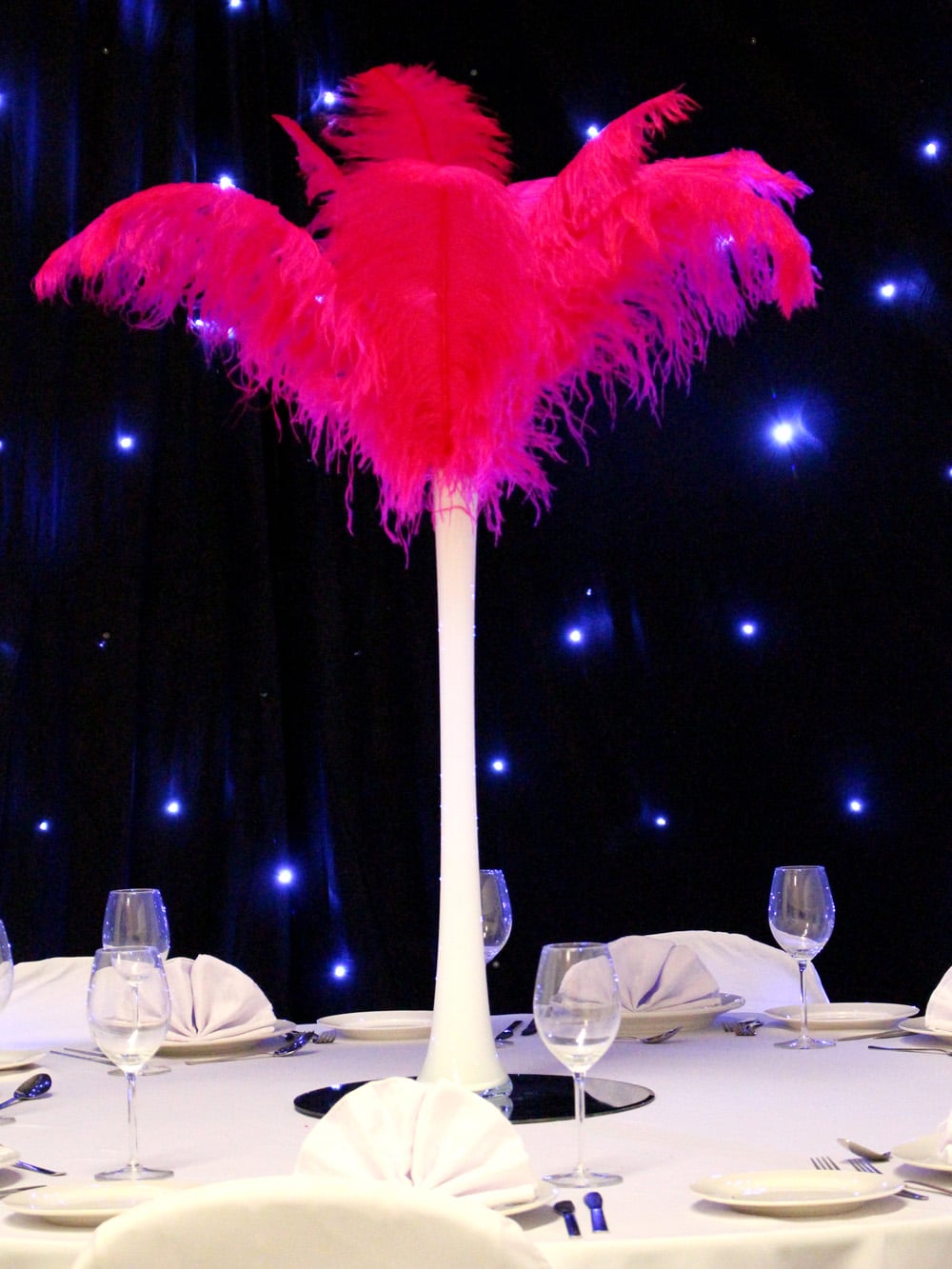 Feather Table Centres available for hire (White Lily Vase). Our beautiful Feather Table Centre’s are a great show-stopping choice for a table centre for any event. They would look great dressed with red feathers for Circus or a Burlesque themed event, or use with black feathers for a stunning 1920’s display. They hold 12 feathers and we have a range of colours for you to choose from. Simply speak to a member of the sales team about the options we have available.