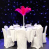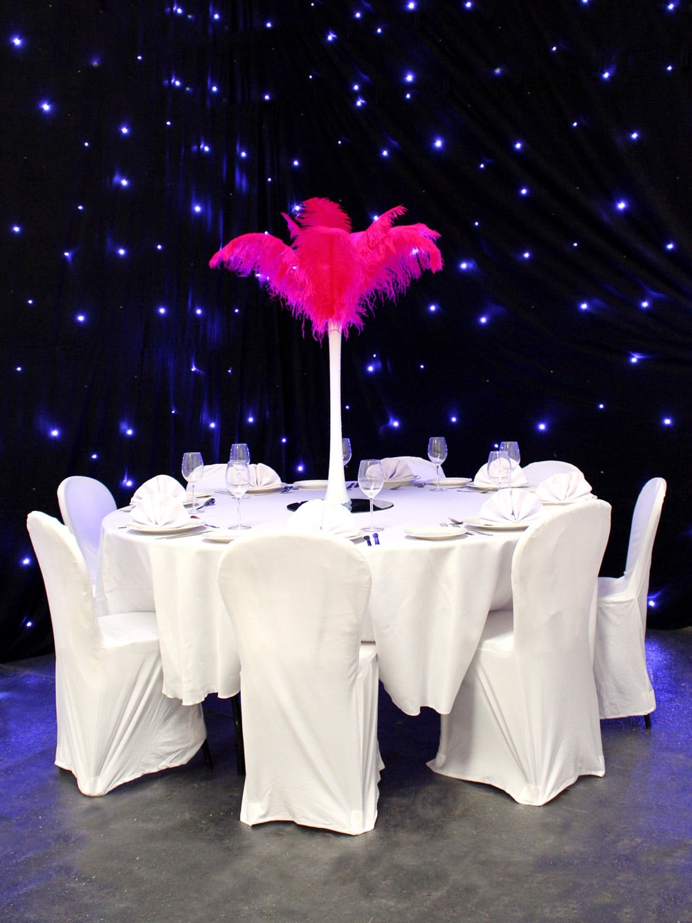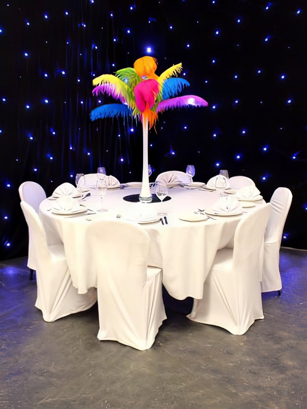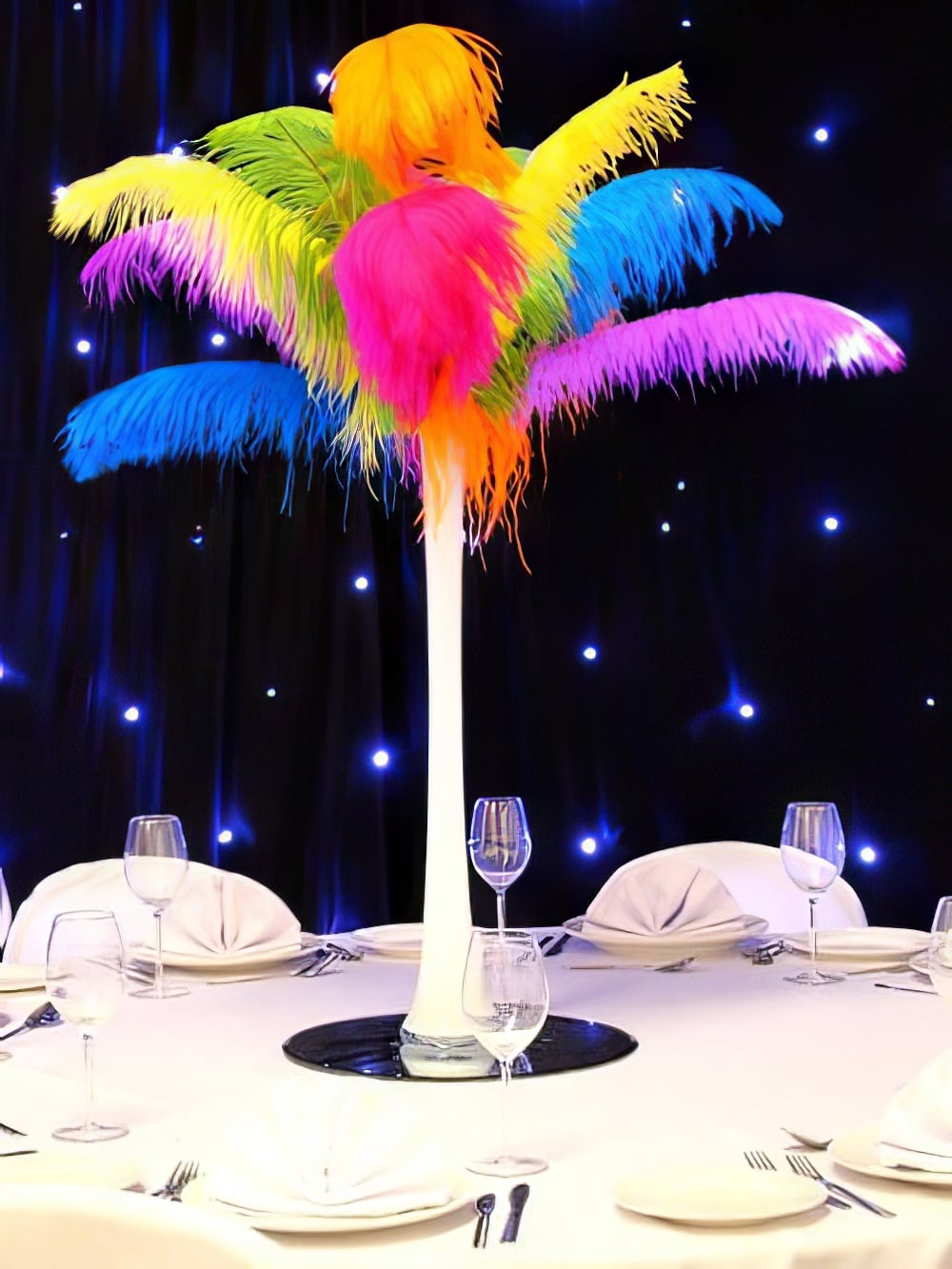 Feather Table Centres available for hire (White Lily Vase). Our beautiful Feather Table Centre’s are a great show-stopping choice for a table centre for any event. They would look great dressed with red feathers for Circus or a Burlesque themed event, or use with black feathers for a stunning 1920’s display. They hold 12 feathers and we have a range of colours for you to choose from. Simply speak to a member of the sales team about the options we have available.