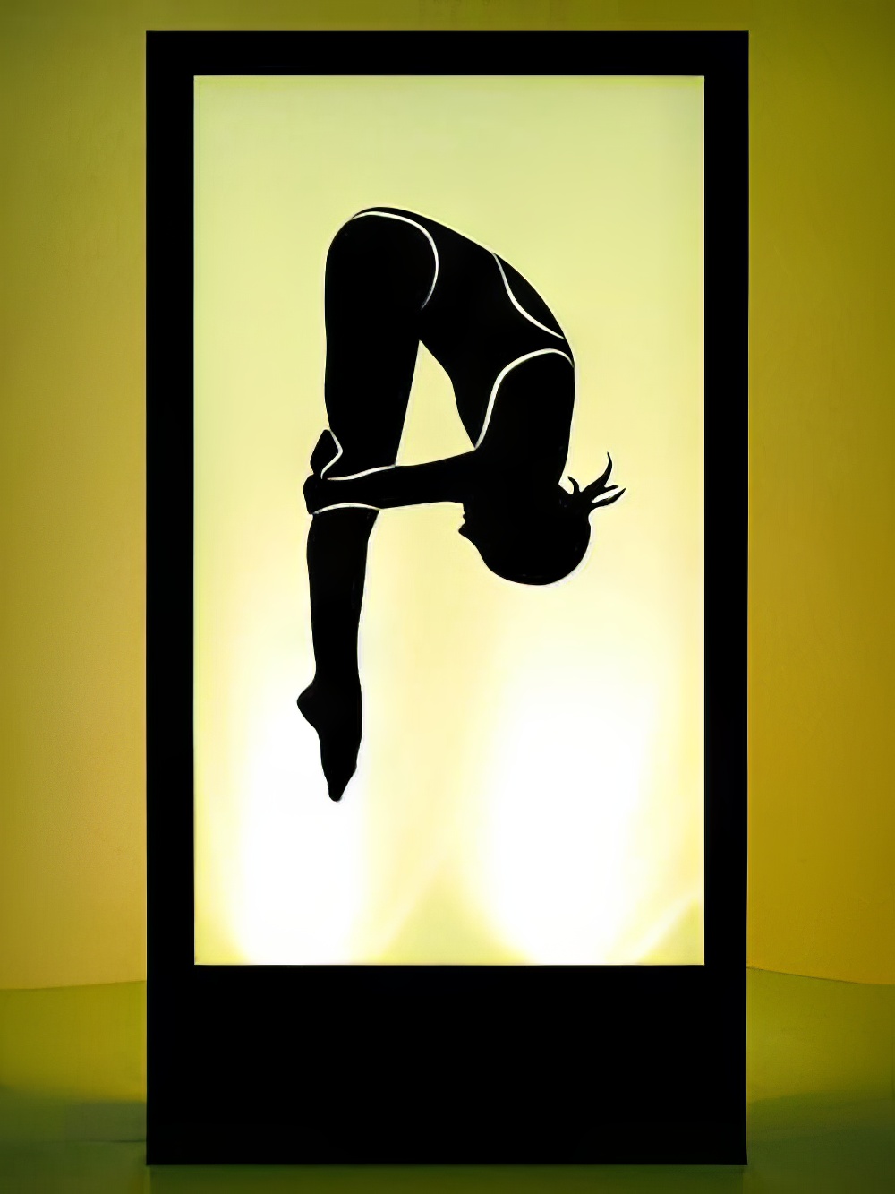 Female Diver Silhouette Panel to hire. All of our silhouette panels come supplied with colour changing Parcan lighting. Lighting colour may vary from that shown. All Parcan lights have a 1m lead and it is the responsibility of the client to provide extension leads if longer leads are required.