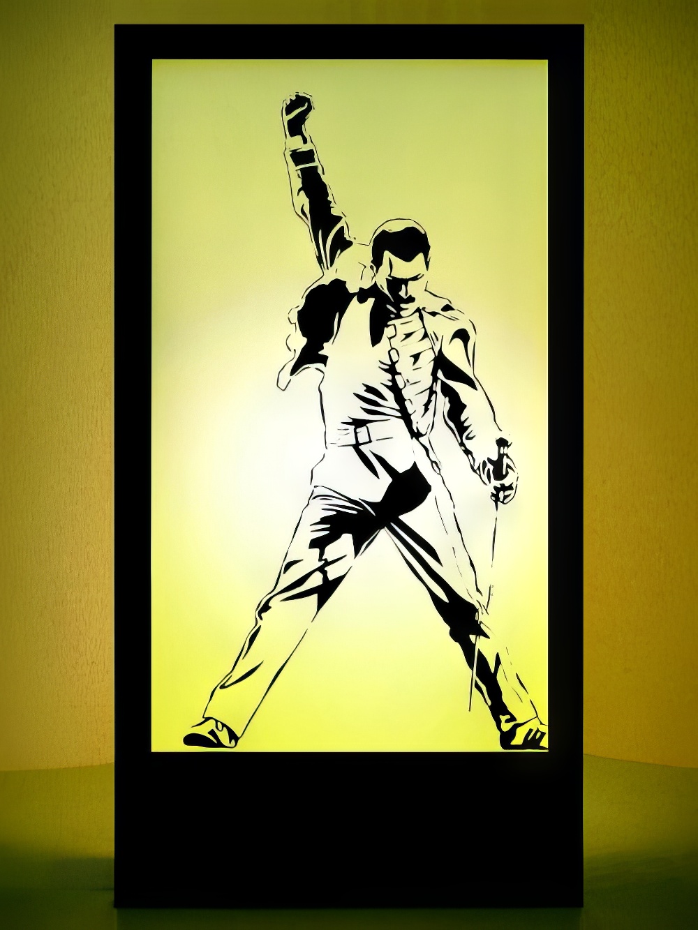 Freddie Mercury silhouette panel prop to hire. This prop to hire along with our other 80’s silhouette panel props will make great additions to the themed decoration of any 80’s or pop music themed event party night. All our silhouette panels come supplied with lighting. Lighting colour may vary from that shown.