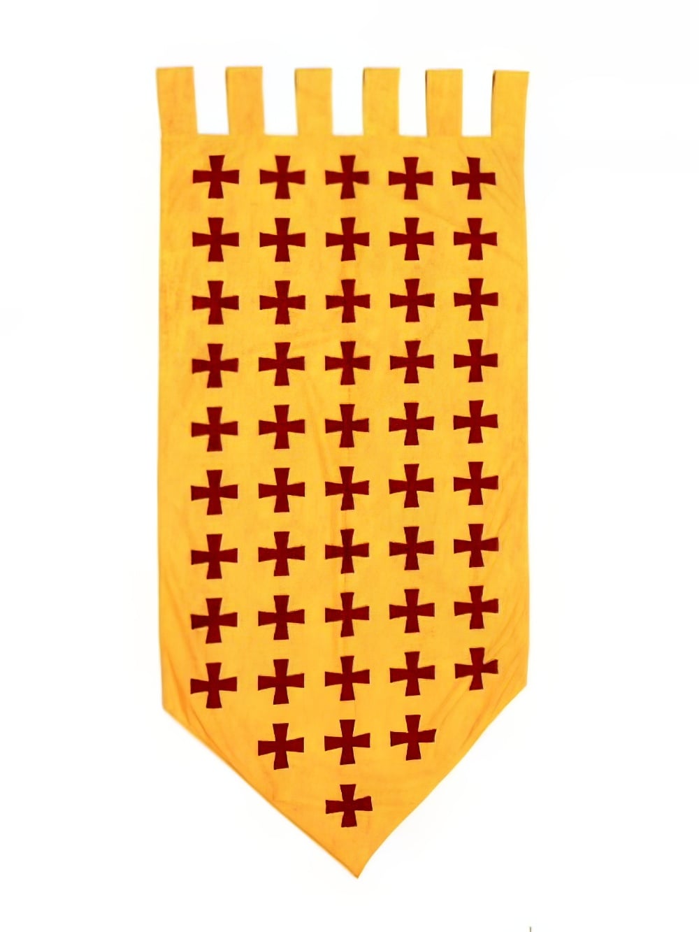 Freestanding Medieval Banner to hire. This is an attractive Medieval Banner, printed on ย double sided cloth and designed to be hung on the pictured banner stand, although you can hire it without the stand if you prefer to hang it via the tabs using your own system. This product code is for the banner stand at 3m high, but we can offer it at 2.4m high also (both pictured); simply let a member of the sales team know which you would prefer.