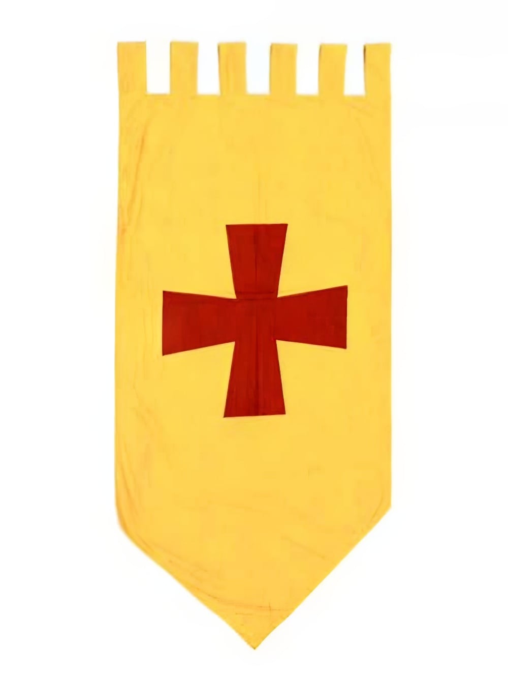 Freestanding Medieval Banner to hire. This is an attractive Medieval Banner, printed on ย double sided cloth and designed to be hung on the pictured banner stand, although you can hire it without the stand if you prefer to hang it via the tabs using your own system. This product code is for the banner stand at 3m high, but we can offer it at 2.4m high also (both pictured); simply let a member of the sales team know which you would prefer.