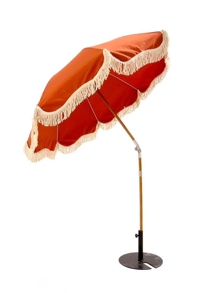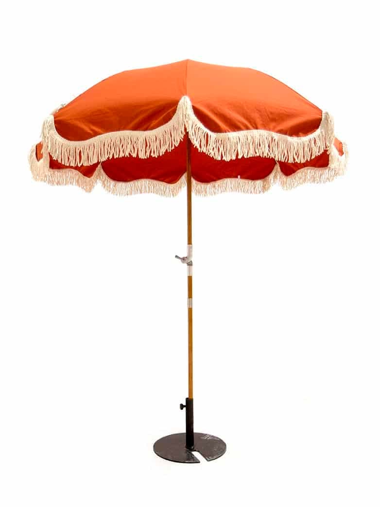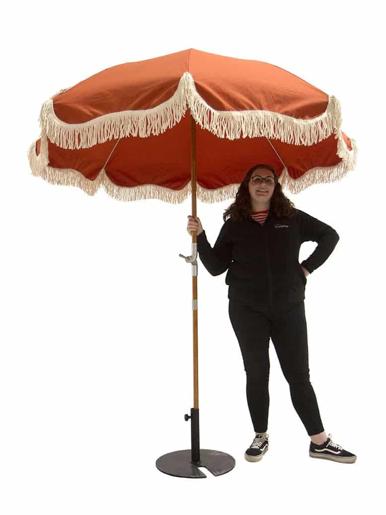 Fringed Parasol ย– Burnt Orange to hire. This stylish fringed parasol would make a lovely addition to a summer, beach club themed event. It also tilts to the side to keep shade on your guests as the sun moves.