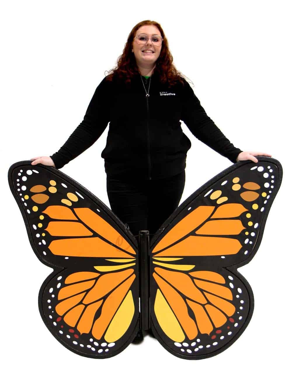 Giant Butterfly to hire. Our Giant Butterfly is a beautiful addition to any Enchanted Forest themed event. The Giant Butterfly is available in four colours; purple, orange, blue & pink. Surround our Giant Butterfly with lots of foliage, rocks and mushrooms to create the perfect magical forest setting.