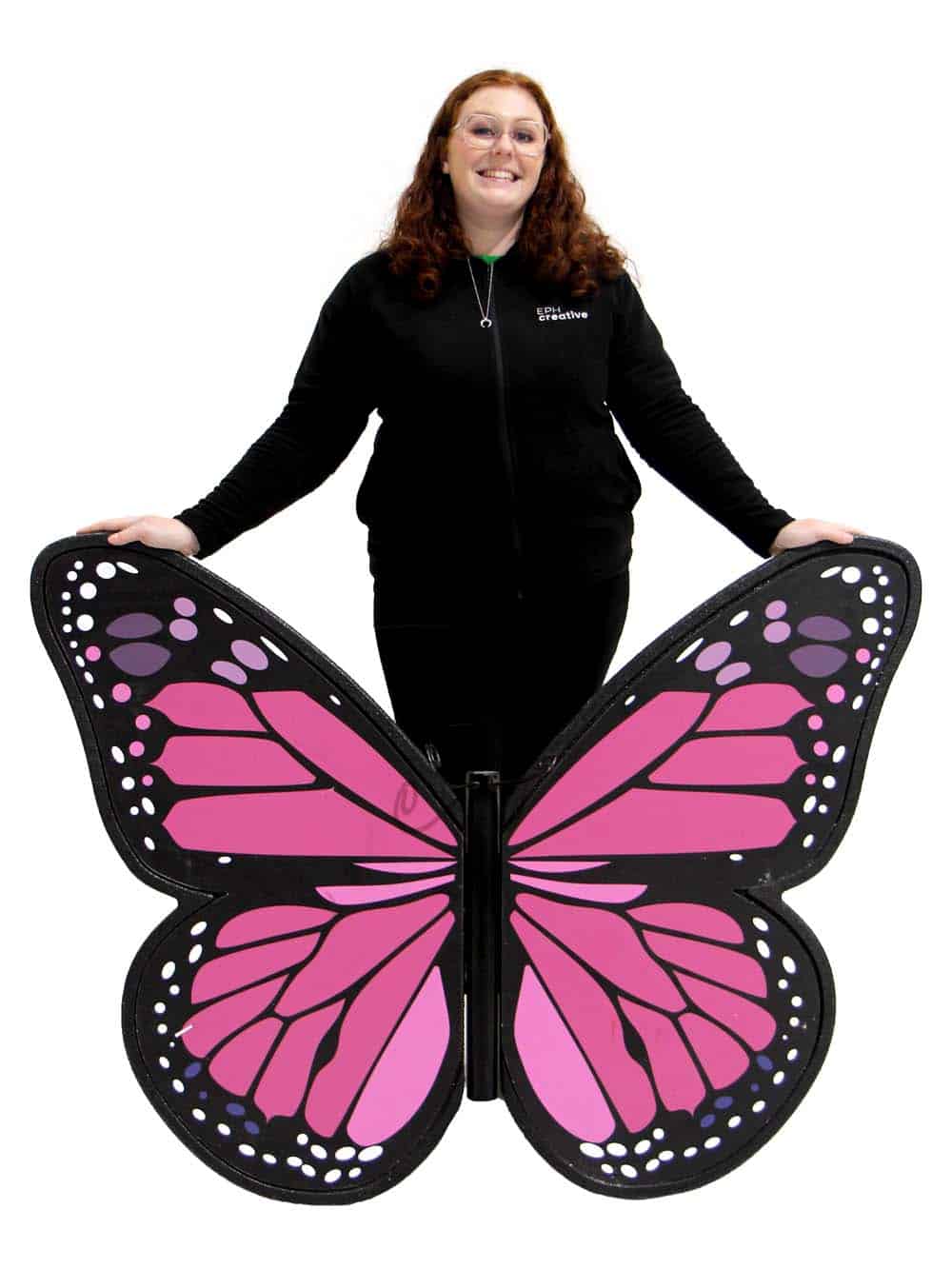Giant Butterfly to hire. Our Giant Butterfly is a beautiful addition to any Enchanted Forest themed event. The Giant Butterfly is available in four colours; purple, orange, blue & pink. Surround our Giant Butterfly with lots of foliage, rocks and mushrooms to create the perfect magical forest setting.
