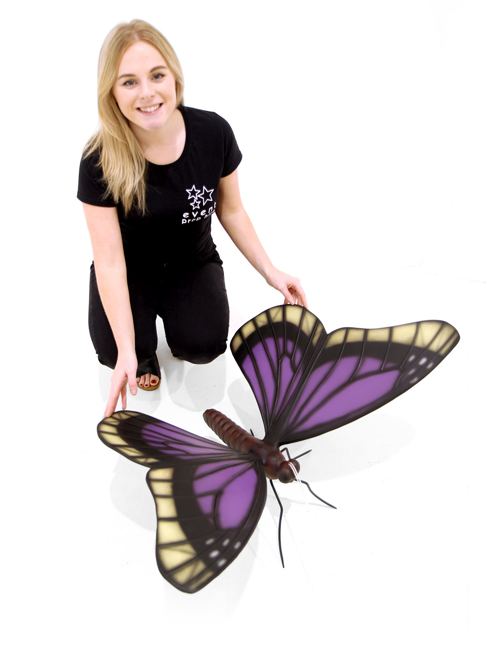 Giant Butterfly to hire. Our Giant Butterfly is a beautiful addition to any Enchanted Forest themed event. The Giant Butterfly is available in four colours; purple, red, blue & pink. Surround our ย Giant Butterfly with lots of foliage, rocks and mushrooms to create the perfect magical forest setting.