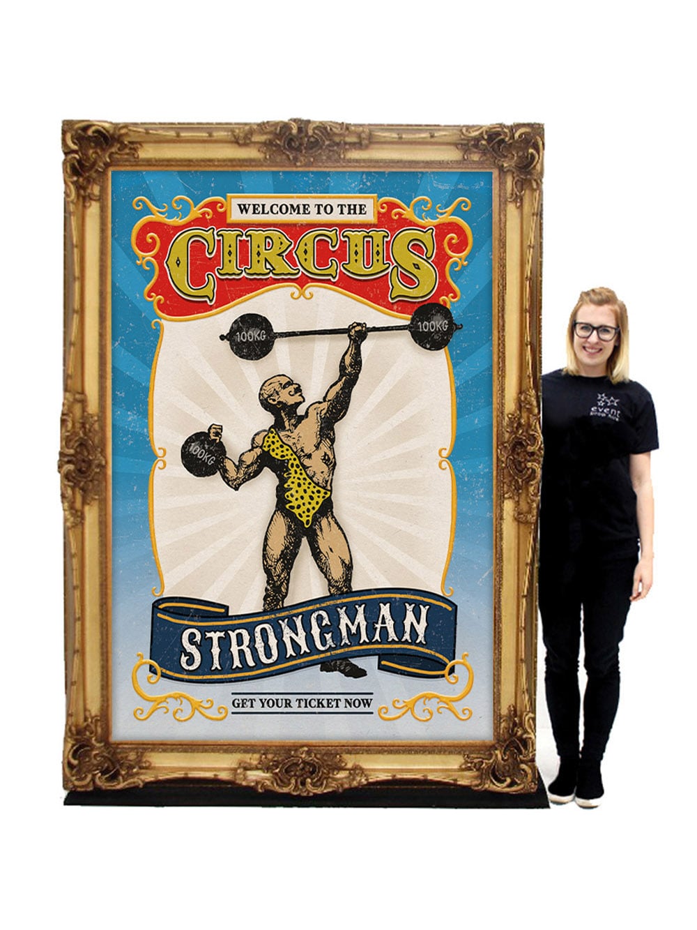 Giant Framed Sign with Strongman Circus Print to hire. A perfect welcome for your guests to your Circus themed party event. We have a collection of Vintage Circus prints a great addition to your Greatest Showman Themed events. The prop is freestanding and is easy to assemble without tools.