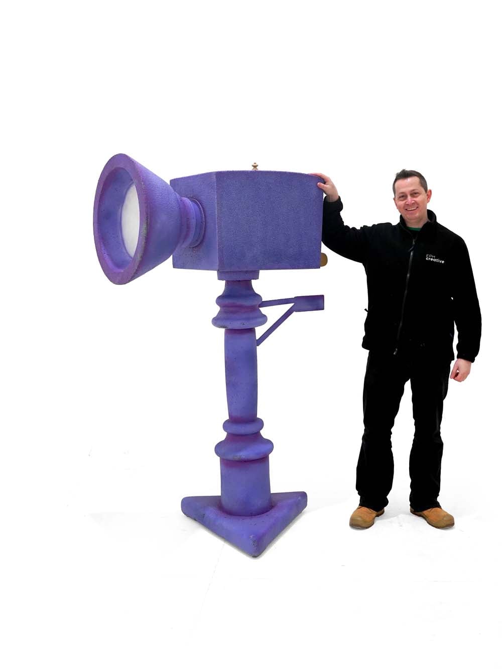 Giant Purple Camera for hire. Elevate the visual appeal of your event with our Giant Purple Film Camera! This unique and eye-catching prop is sure to capture the attention of your guests, adding a touch of charm and nostalgia to any occasion. Crafted with attention to detail, our Giant Purple Camera boasts a striking design inspired by the imagination of a chocolate factory. Standing tall and proud, it serves as both a decorative centrepiece and a memorable photo opportunity, perfect for weddings, parties, corporate events, and more. Whether you’re hosting a themed event or simply looking to add a standout element to your decor, our Giant Purple Camera is sure to impress. Its vibrant purple hue adds a pop of colour to any setting, while its film camera design adds a hint of retro flair.