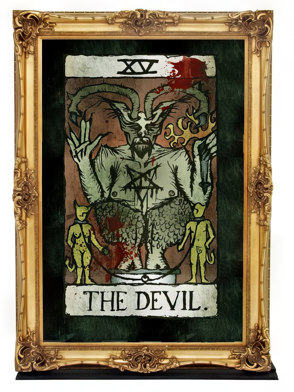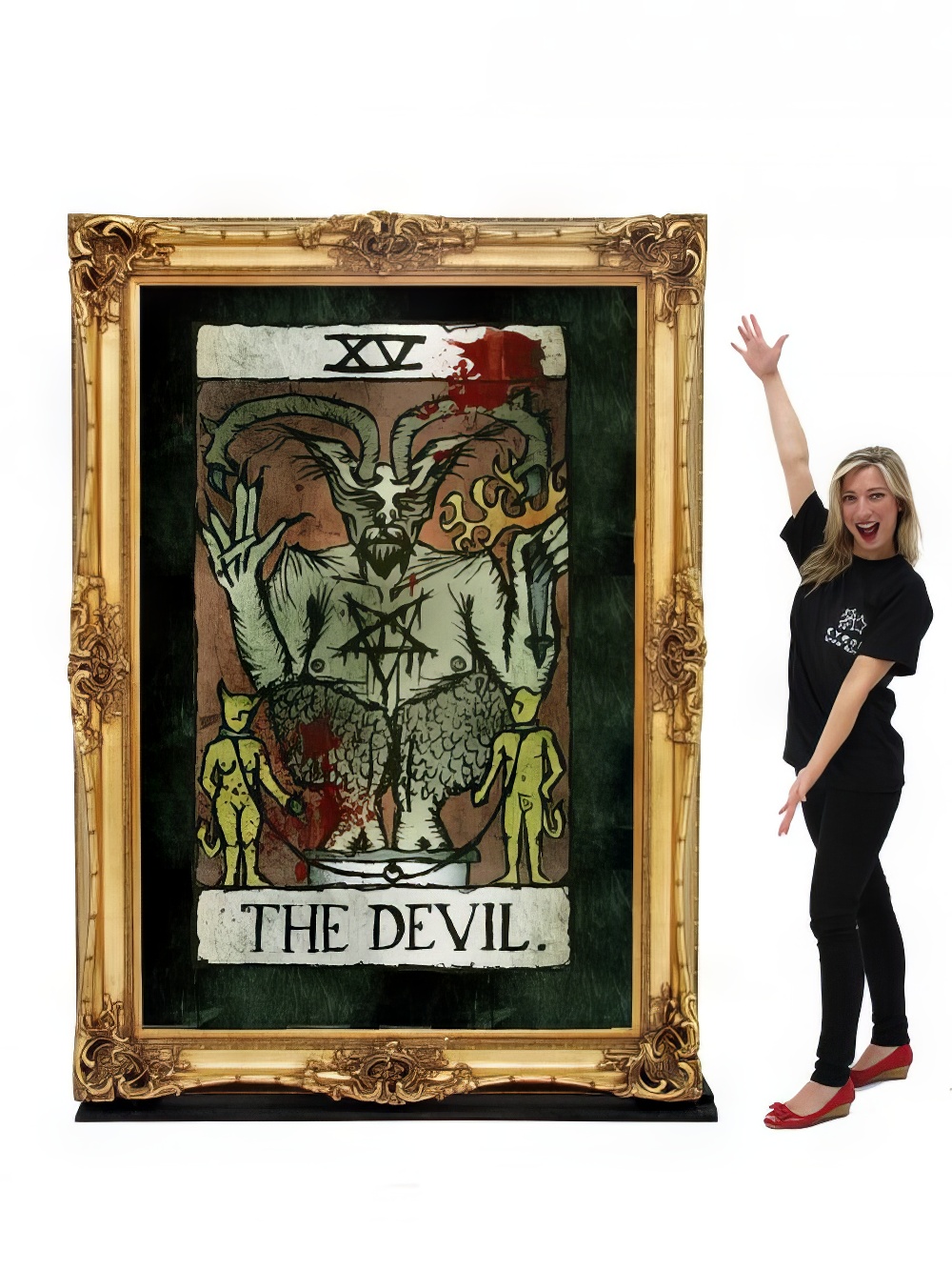 Tarot Card depicting The Devil for hire. This Giant Tarot Card comes complete with one of our fantastic freestanding giant gold frames and would really help to set the scene at any Halloween event or party. We have four different Tarot Cards, so why not hire the set and position them around your venue?