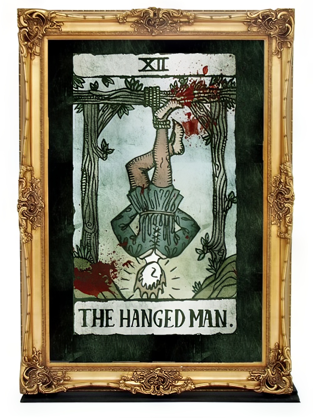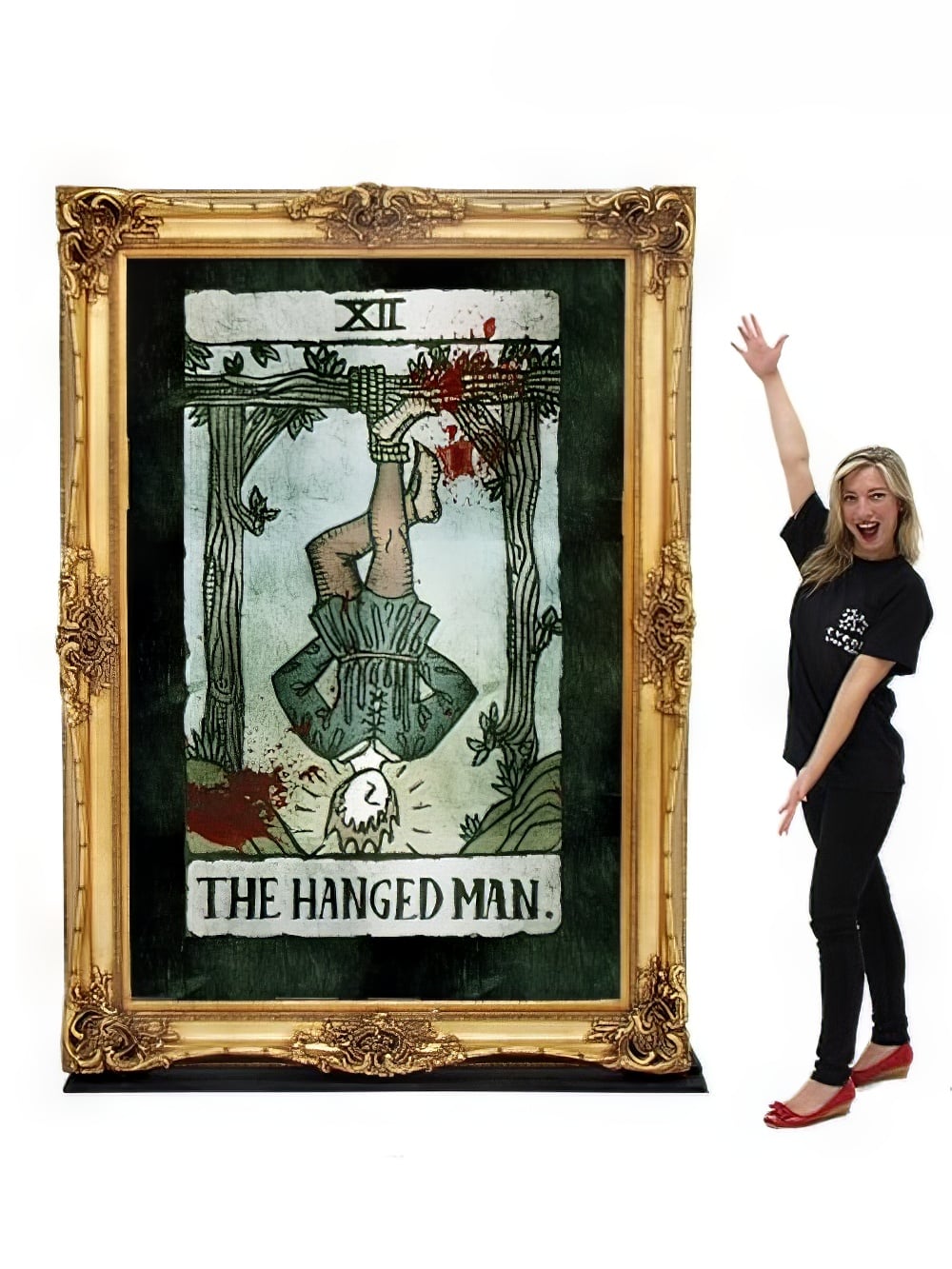 Tarot Card depicting The Hanged Man for hire. This Giant Tarot Card comes complete with one of our fantastic freestanding giant gold frames and would really help to set the scene at any Halloween event or party. We have four different Tarot Cards, so why not hire the set and position them around your venue? The Hanged Man Tarot Card is can be interpreted in two very different ways. It may simply indicate upheaval or change in your future, perhaps beyond your control, but more likely a decision that, for good or ill, you will not be able to turn back from. Or it may indicate sacrifice, either small or great, and that you should give very careful thought to the decisions in your life!