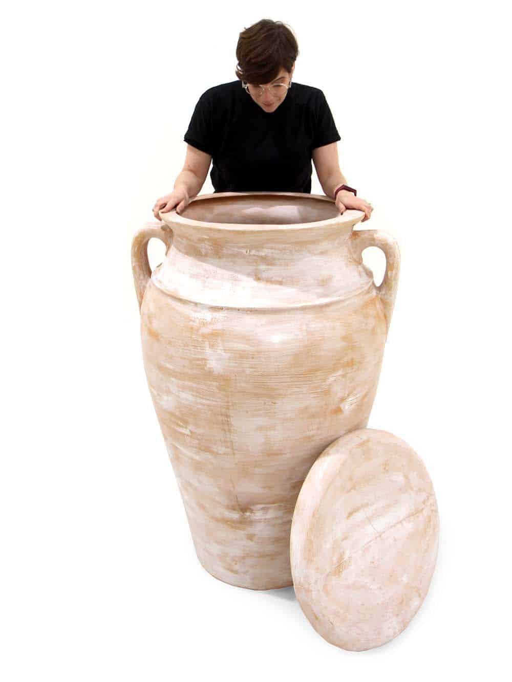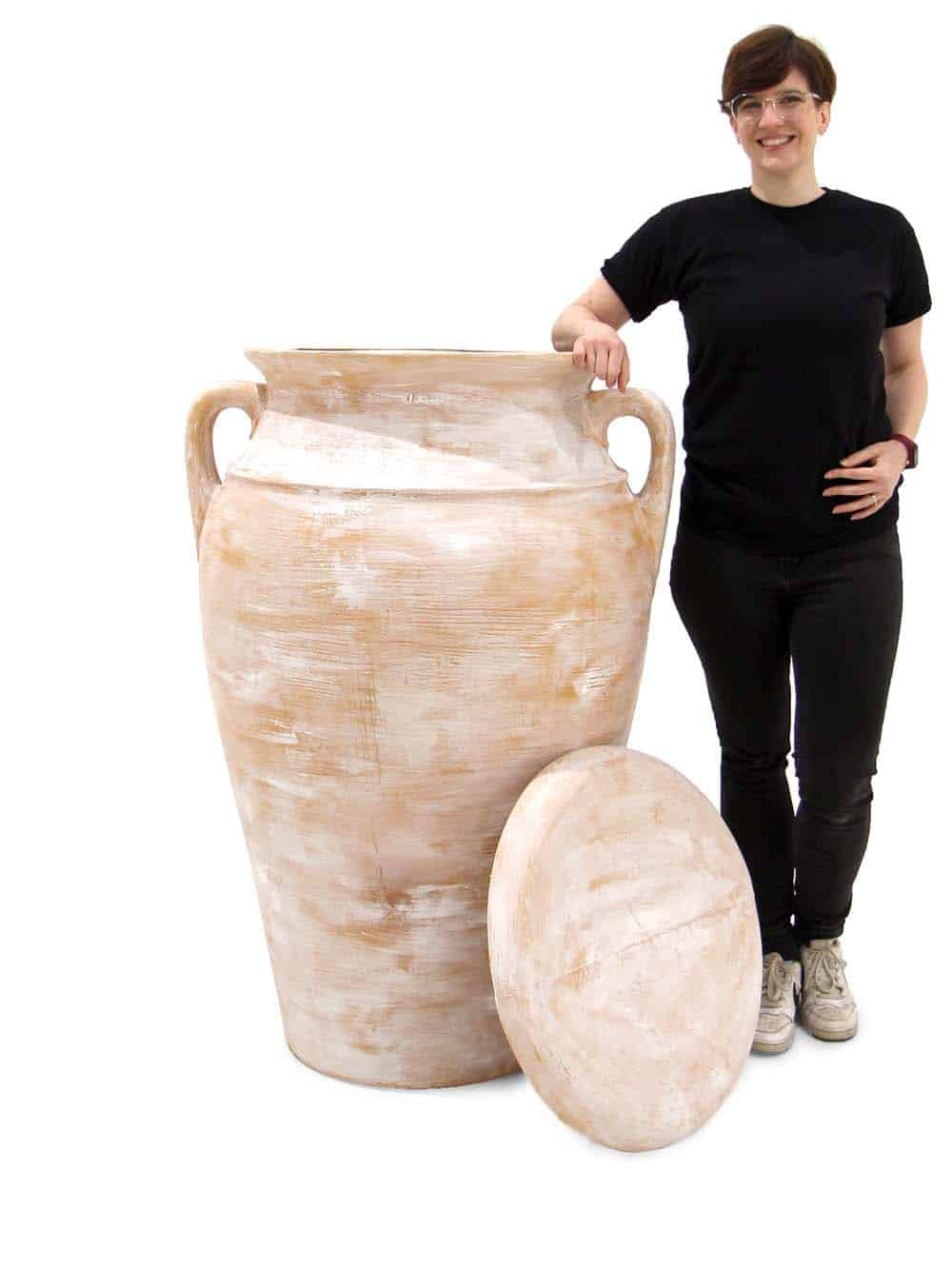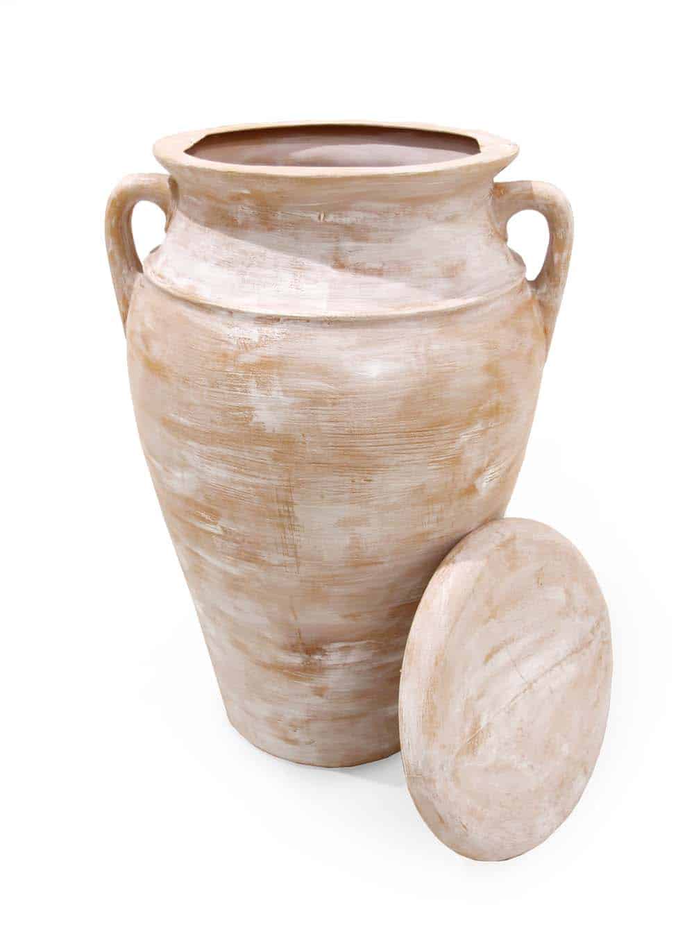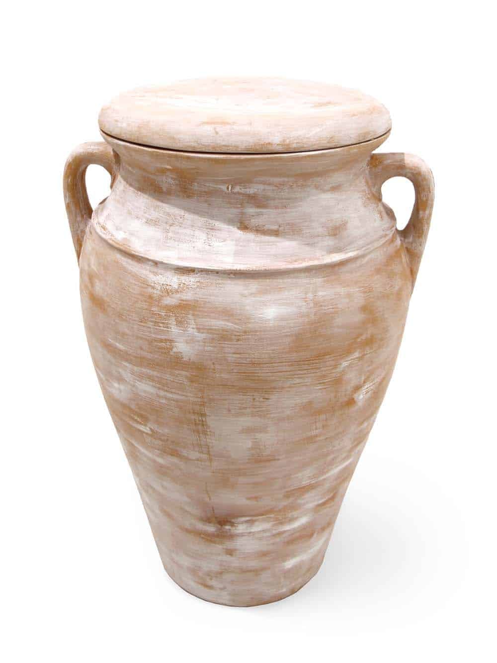 Giant stone effect whit washed Urn with lid. Perfect to go with plants and other outside props for a mediterranean theme or garden party.