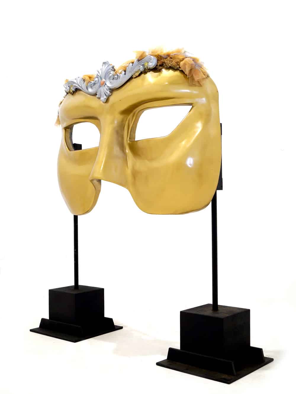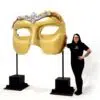 Giant Venetian Eye Mask for hire. Sculpted fully 3D Venetian Eye Mask in gold finish with beautiful soft furnished edges. This prop can be freestanding as pictured or can be suspended. When standing as pictured, this prop stands at over 2 metres tall, giving it spectacular presence at your Venetian themed event. When standing as pictured, this prop stands at over 2 metres tall, giving it spectacular presence at your Venetian themed event.