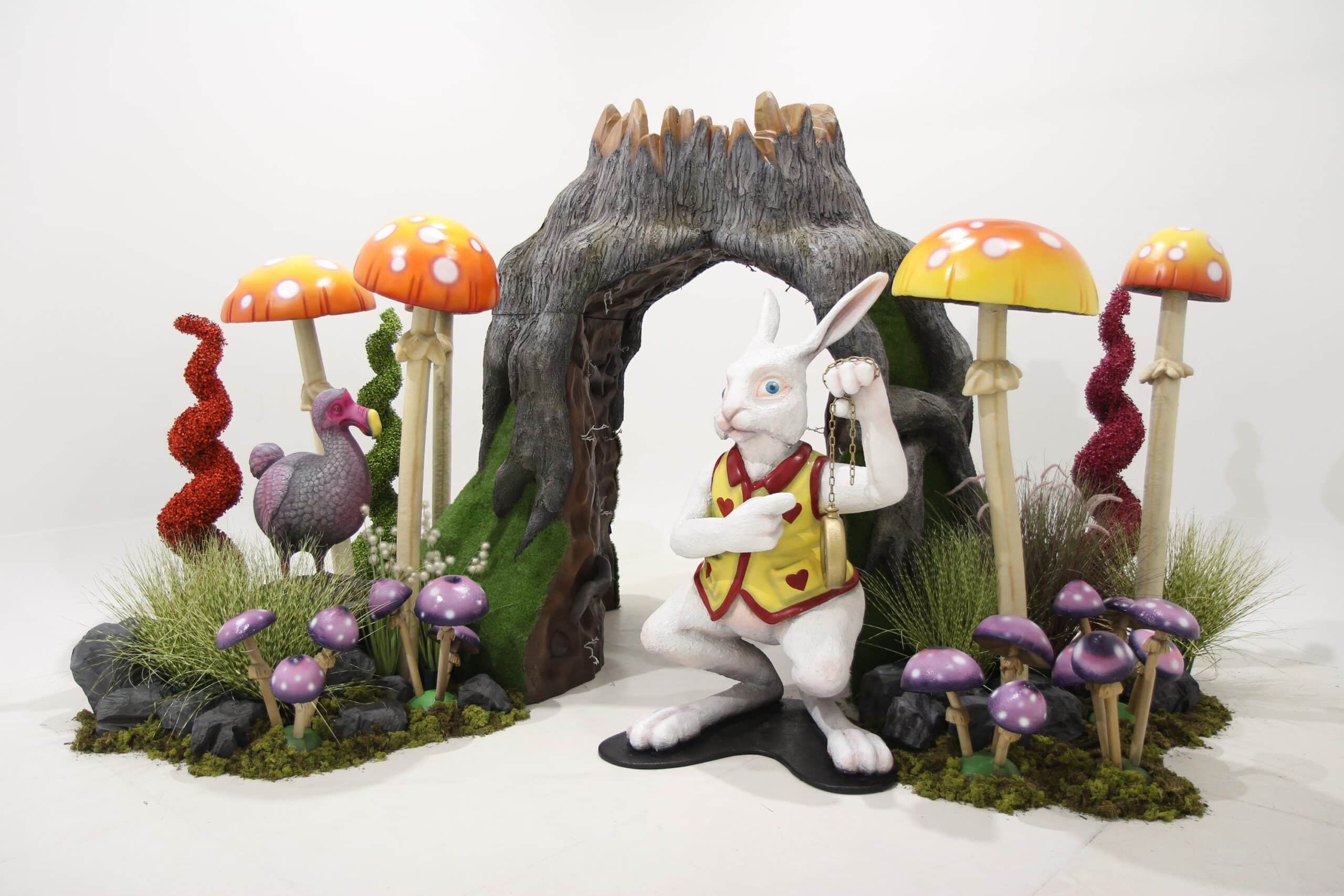 Grassy Tunnel Entranceway – Double Sided for hire. “The Rabbit Hole went straight on like a tunnel for some way, and then dipped suddenly down, so suddenly that Alice had not a moment to think about stopping herself before she found herself falling down a very deep well.”. This ย Grassy Tunnel Entranceway is the perfect addition to any Alice in Wonderland or Enchanted Forest themed events. This showstopping entrance will really add the WOW factor for when your guests arrive, imagine walking through the tunnel into your event… how fabulous! Pair the Grassy Tunnel Entranceway with our This Way, That Way Sign and Giant 3D White Rabbit for perfect entranceway and photo opportunity montage.