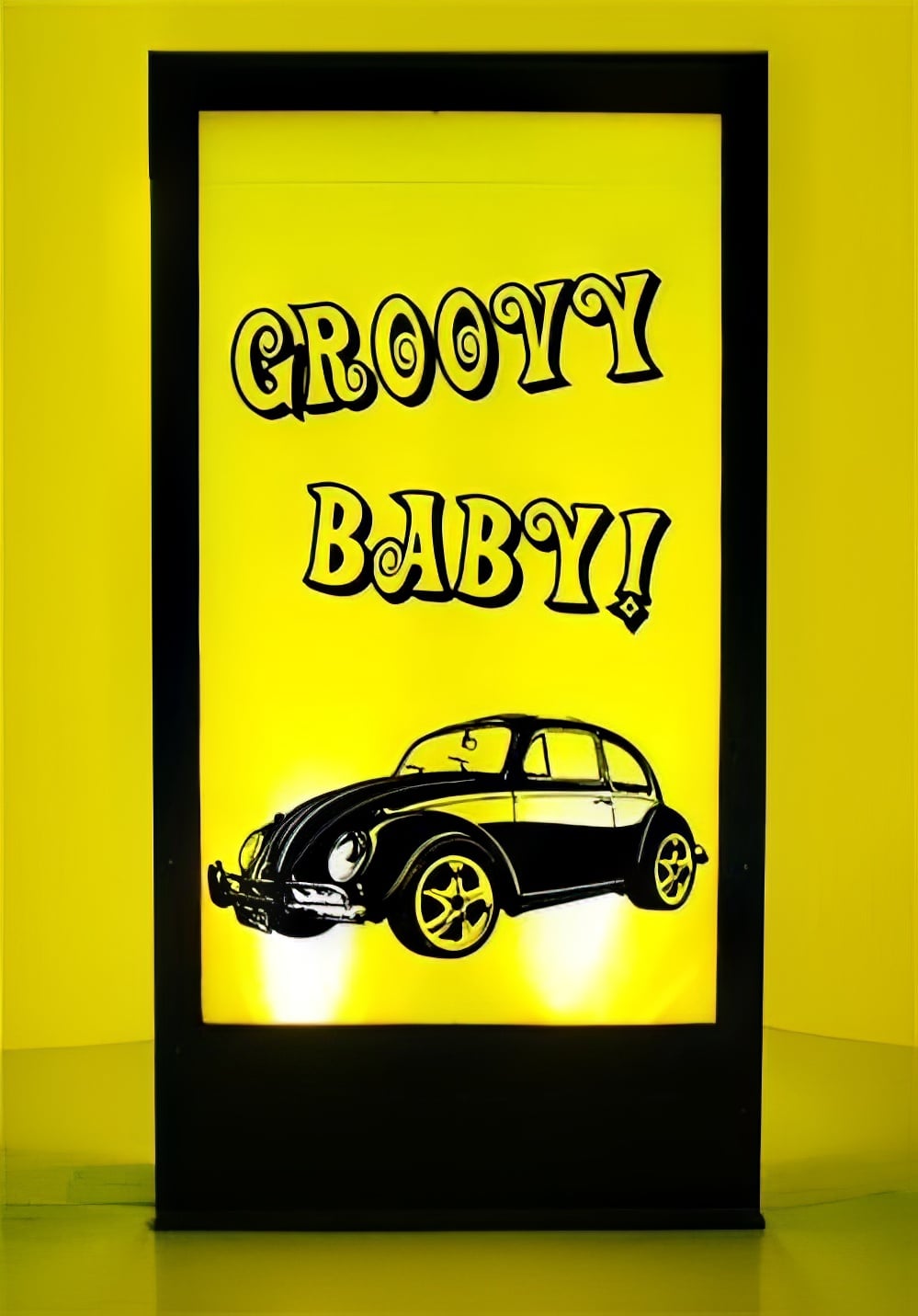 Groovy Baby Silhouette Panel to hire. This is a lit silhouette panel depicting the iconic people’s car, the Volkswagon Beetle, with the words ‘Groovy Baby’ too!