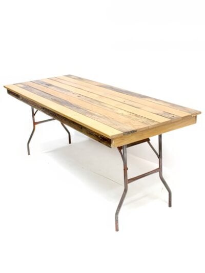 Vintage effect ย 6ft Trestle Table for Hire. This is a lovely traditional vintage style trestle table, useable in any theme – simply pop it up and then dress it any way you want to fit in with your decor or theme.
