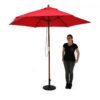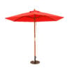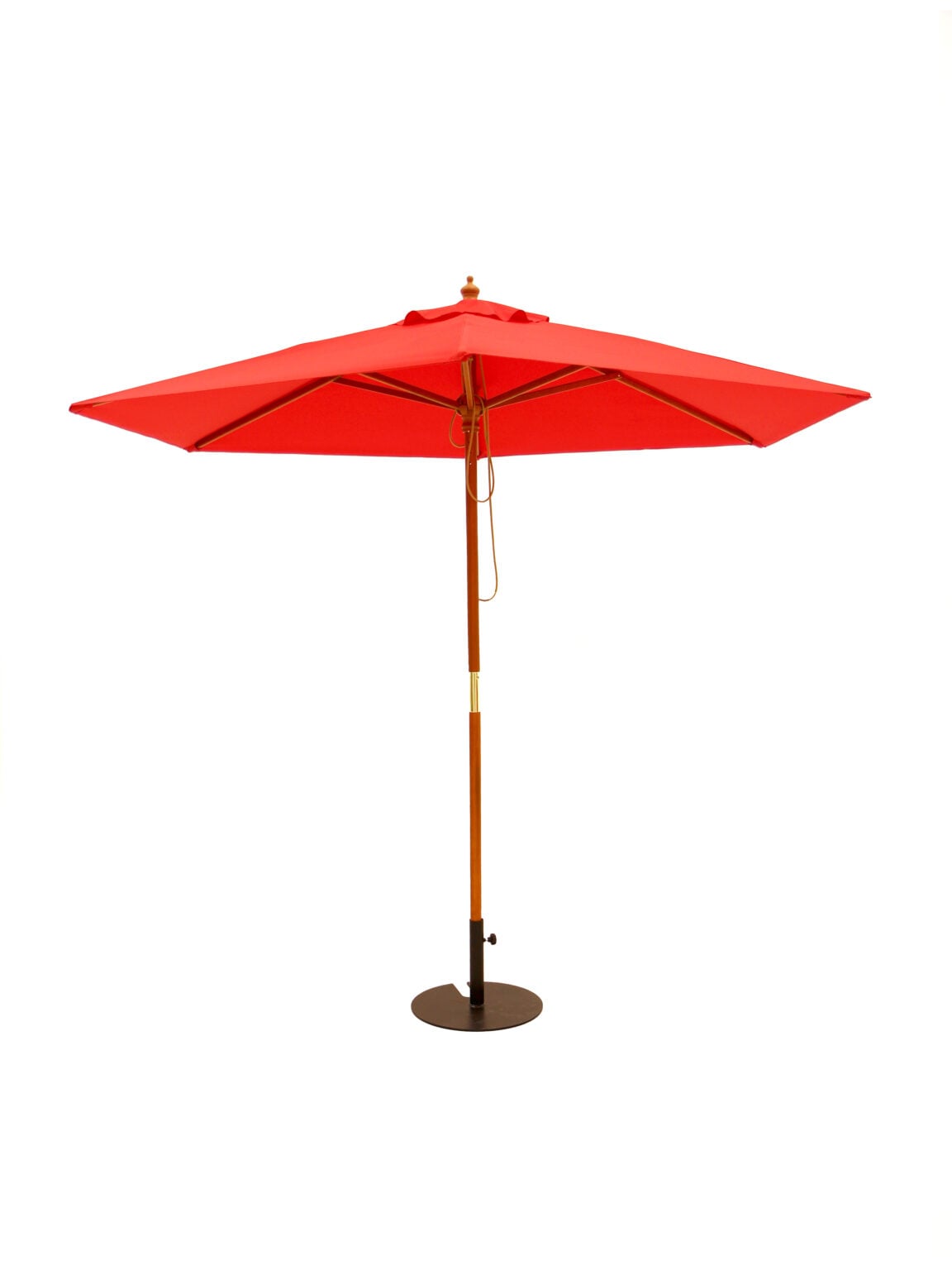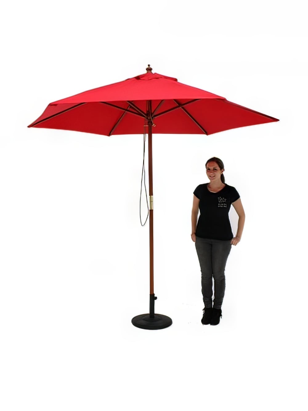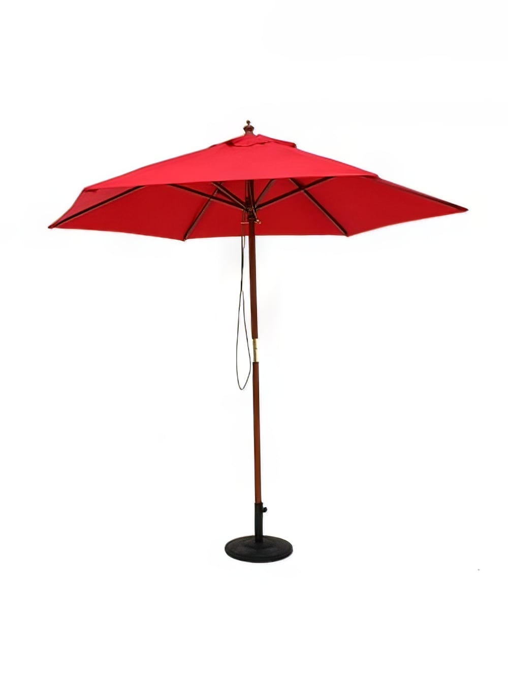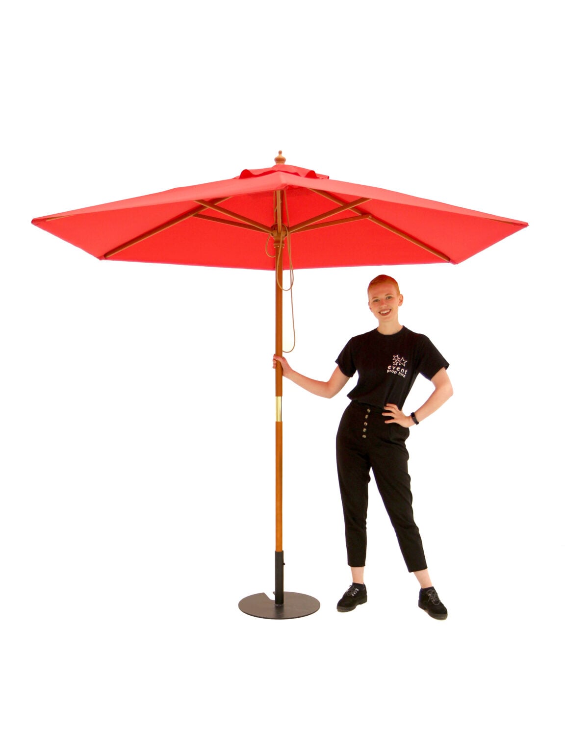 Hexagonal Parasol in Red to hire. This beautiful bright red parasol will definitely provide a splash of colour that will brighten up your event or party. Hexagonal in shape and 2m wide this is a quality product, constructed with a heavy duty wooden frame and a water resistant canopy. Simply pull the cord, place the pin in the hole and your parasol is ready for your event! The parasol is supplied with a heavy duty base.