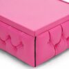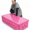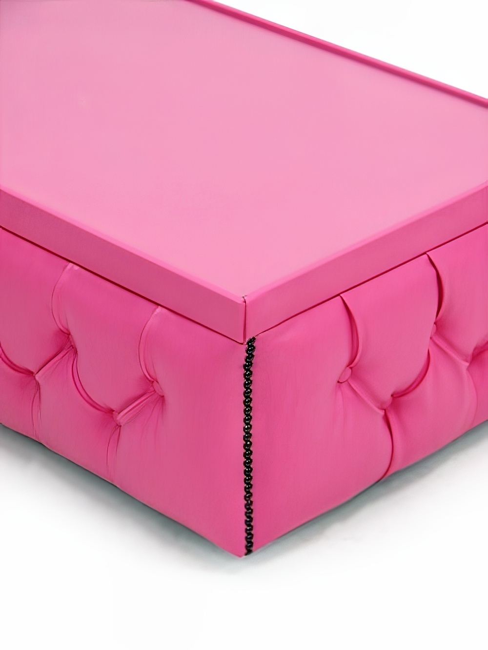 Hot Pink Chesterfield Coffee Table To Hire. Finished in a durable hot pink vinyl, this glass topped coffee table is a matching table to our hot pink chesterfield furniture sofas, armchairs and single seat cubes!