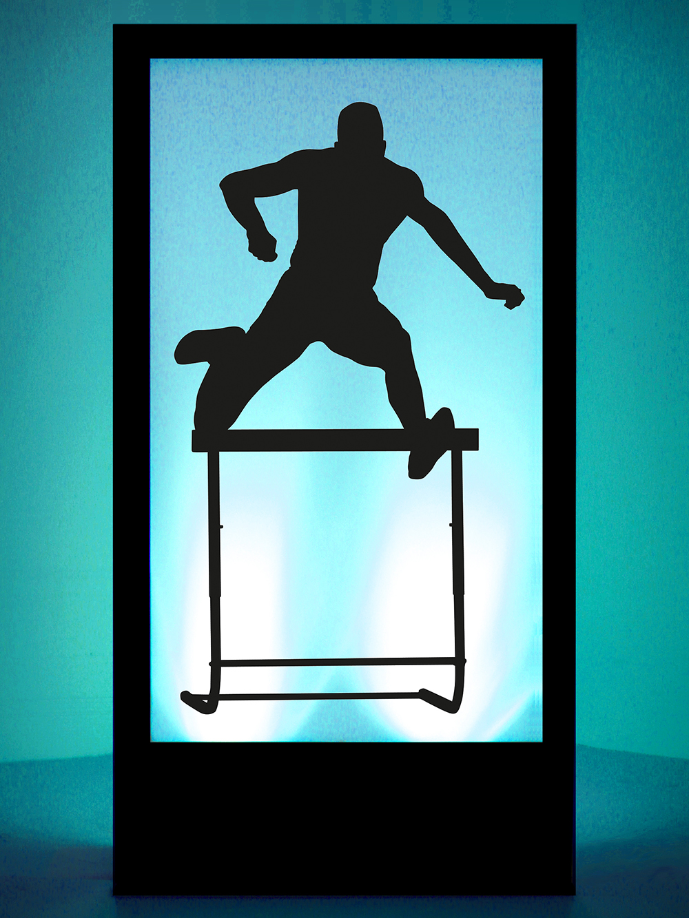 Hurdler Silhouette Panel to hire. This athletic hurdler action shot silhouette panel will be a fantastic addition to your Sport or Olympics themed party or event. All of our silhouette panels come supplied with lighting. The lighting colour may vary from that shown. All Parcan lights have a 1m lead and it is the responsibility of the client to provide extension leads if longer leads are required. .