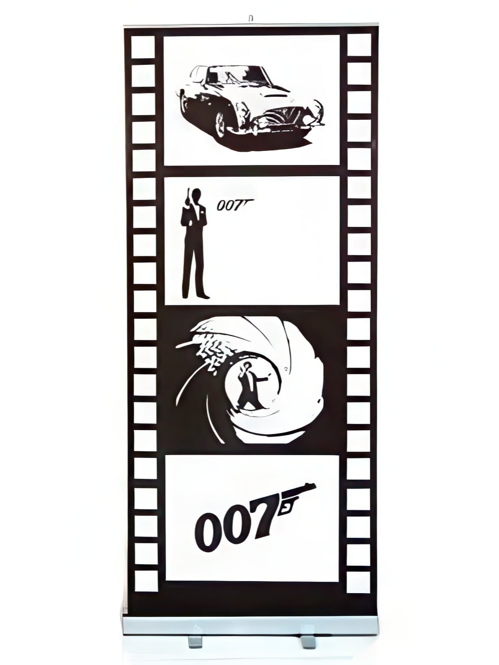 Iconic Bond filmstrip prop to hire. This filmstrip depicts iconic bond images including the Aston Martin DB5. 007 logo & infamous opening credit sequence gun barrel.