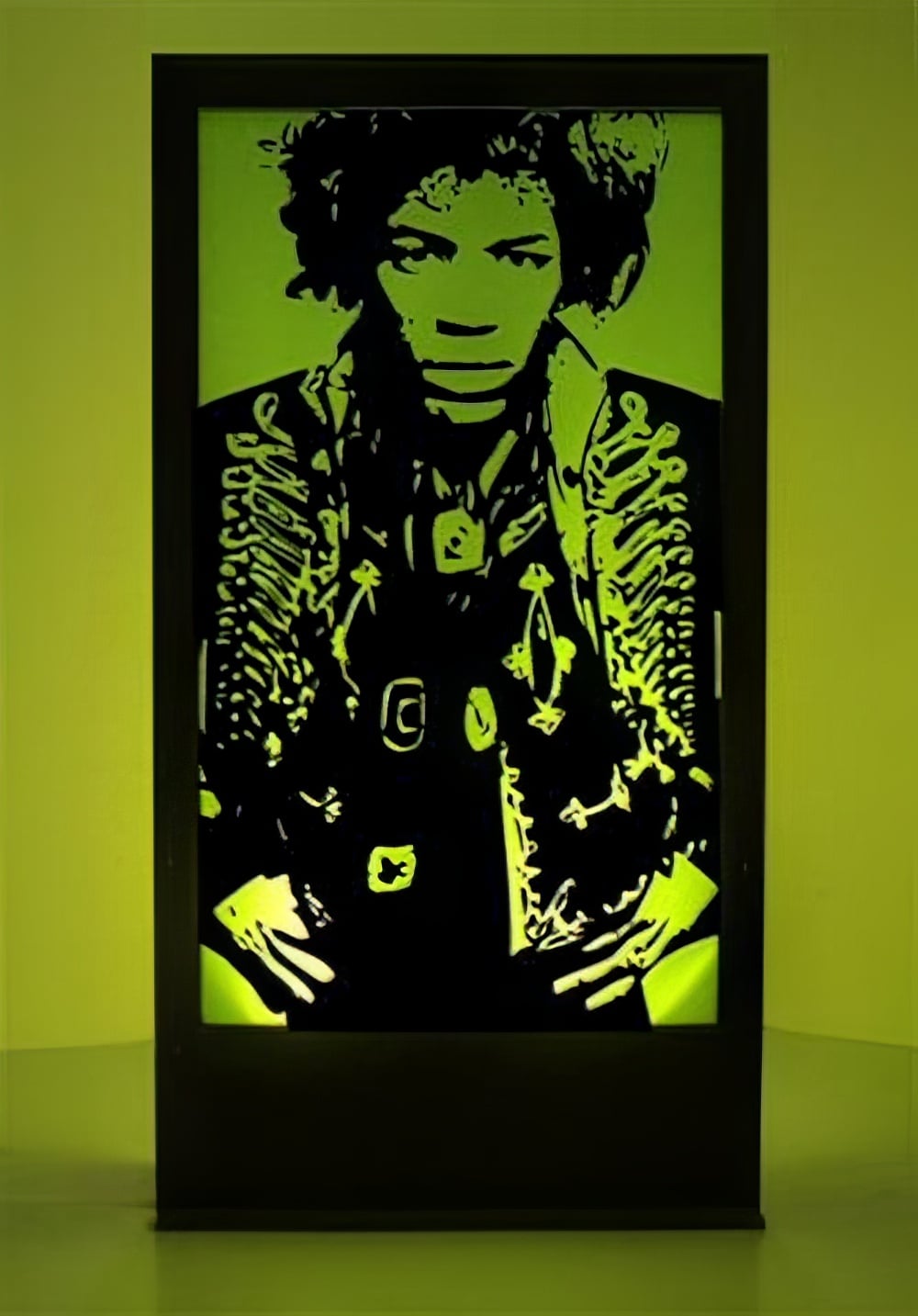 Jimi Hendrix Silhouette Panel to hire. This prop to hire will make a great addition to your themed decoration at your themed event party night. All of our silhouette panels come supplied with lighting. Lighting colour may vary from that shown.