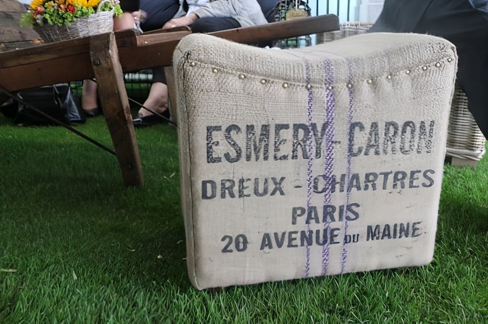 Jute Ottoman to hire. Take a look at this stunning jute ottoman. Padded for comfort, this industrial-looking ottoman would look great in any number of themes; from Parisian to Circus to Pirate.
