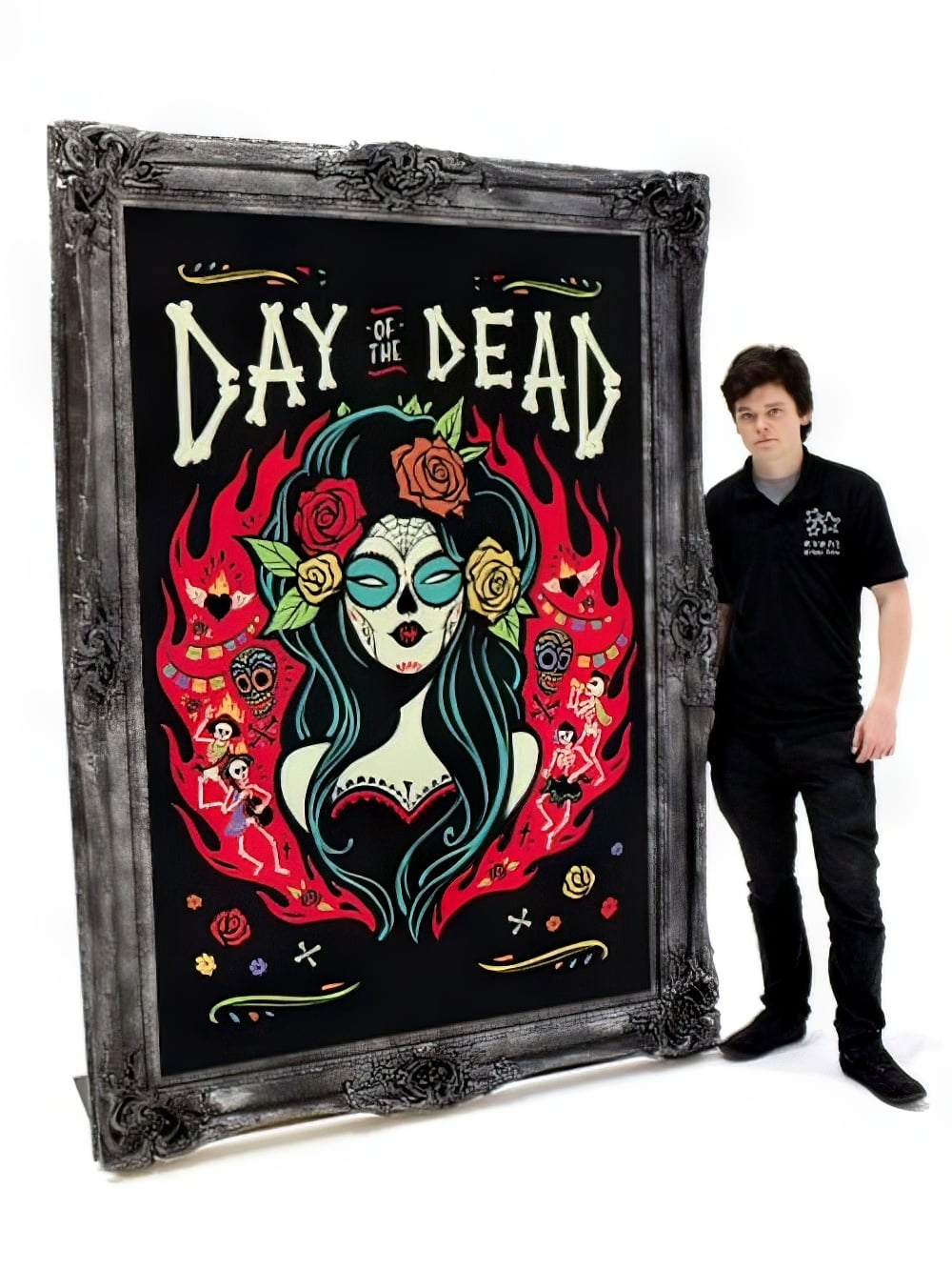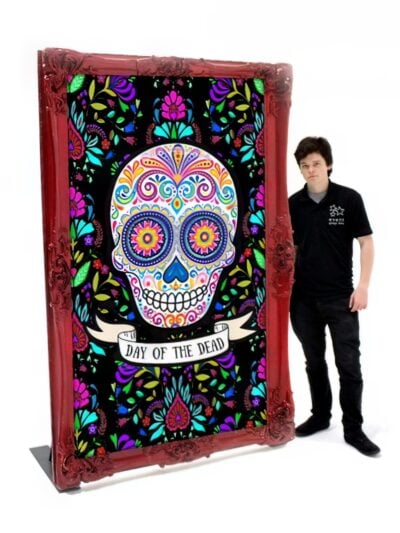 Large Black Frame With Day of the Dead Insert for hire. This giant frame, complete with colourful skull print, is fantastic to help set the scene for your Day of the Dead event. We can offer this print in a red frame also, or have several other insert options for you to choose from; take a look below.