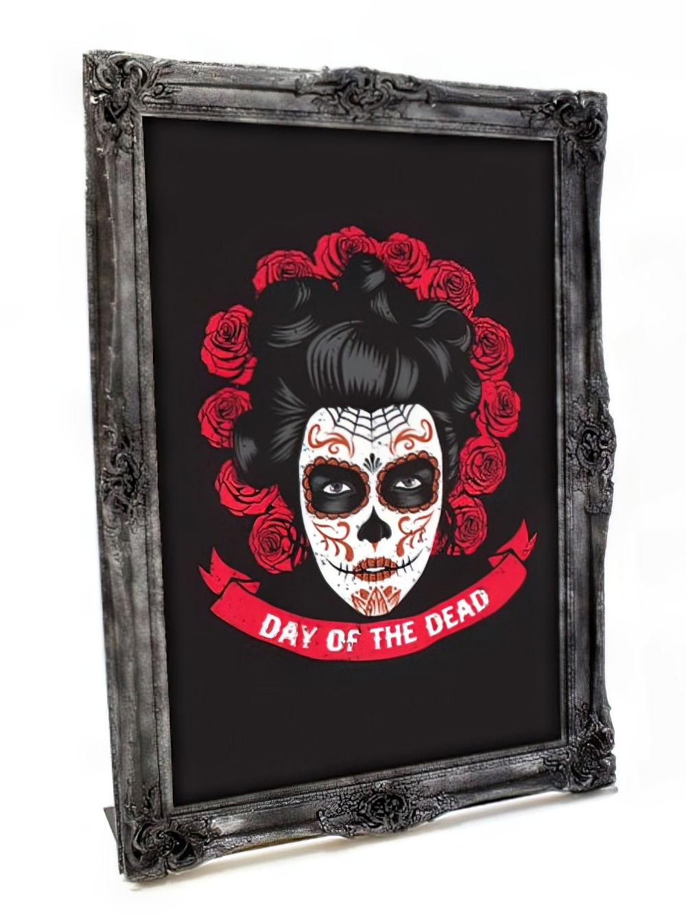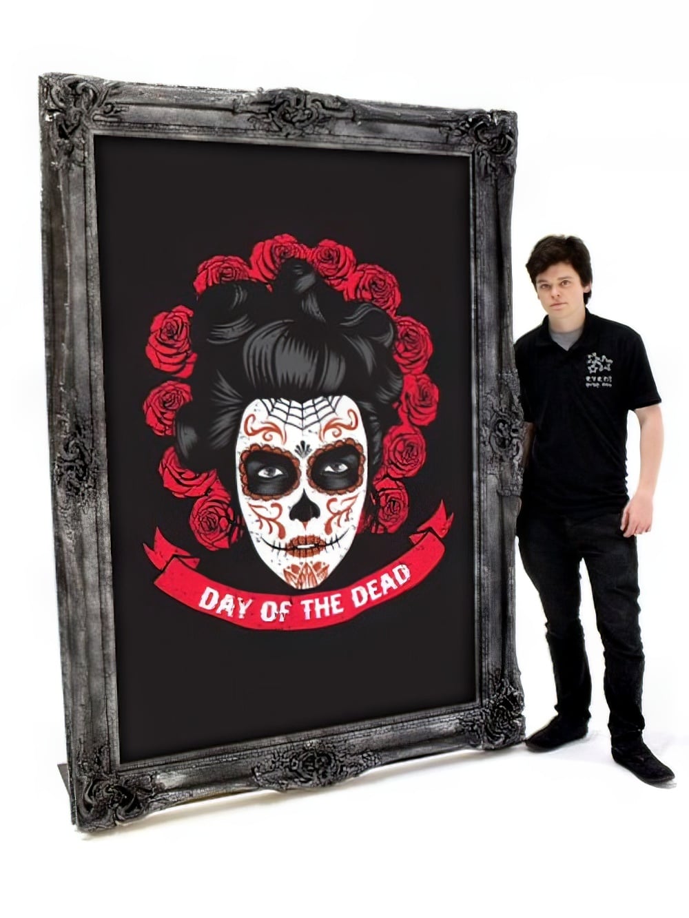Large Black Frame With Day of the Dead Insert for hire. This giant frame, complete with colourful skull print, is fantastic to help set the scene for your Day of the Dead event. We can offer this print in a red frame also, or have several other insert options for you to choose from; take a look below.