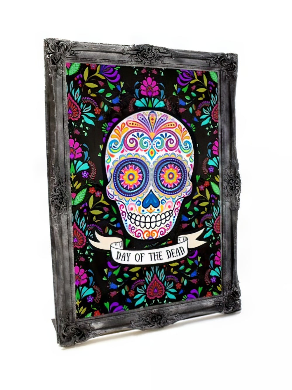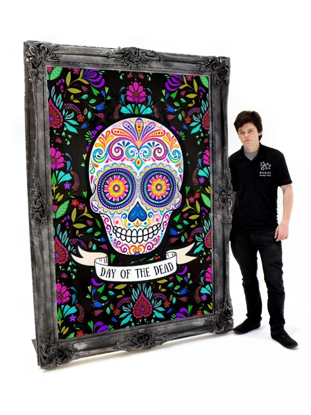 Large Black Frame With Day of the Dead Insert for hire. This giant frame, complete with colourful skull print, is fantastic to help set the scene for your Day of the Dead event. We can offer this print in a red frame also, or have several other insert options for you to choose from; take a look below.