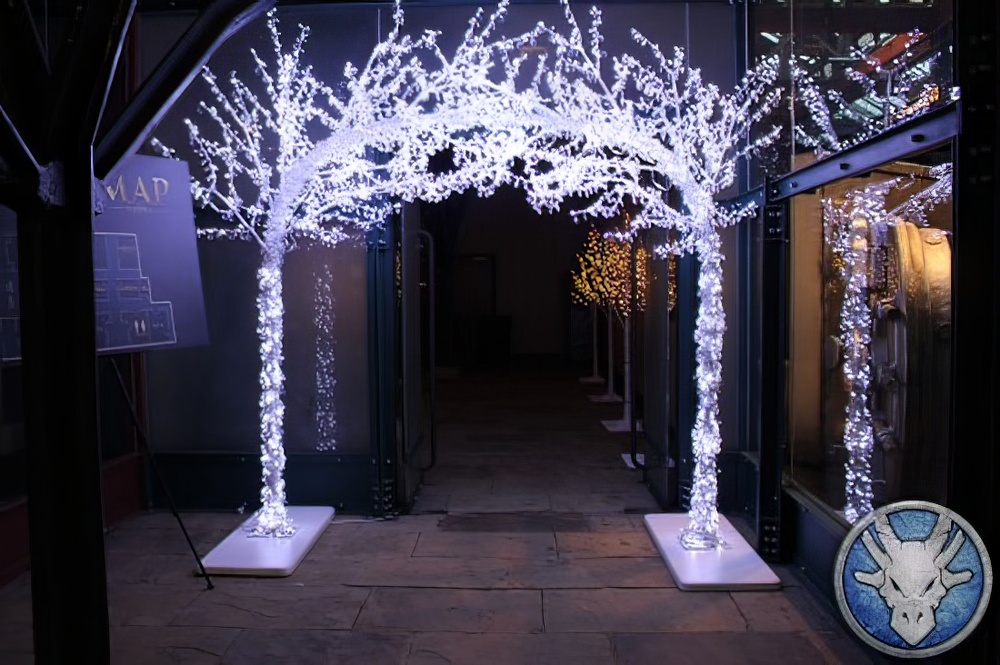 LED Crystal Tree Archway for hire. This beautiful LED Crystal Archway will look stunning as an entranceway at your themed party or event. Suitable for all manner of themes including Narnia, Winter Wonderland and Fairytale, our LED Crystal Archway will really set the scene. The entranceway consists of two intertwined artificial twig trees adorned with hundreds of LED crystals to create this dazzling effect that will truly welcome your guests in style!