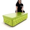 Lime Green buttoned coffee table to hire. Finished in a durable vinyl, this glass topped coffee table is a matching table to our lime green chesterfield furniture sofas, armchairs and single seat cubes! For an entire breakout seating area solution, look no further than this range.