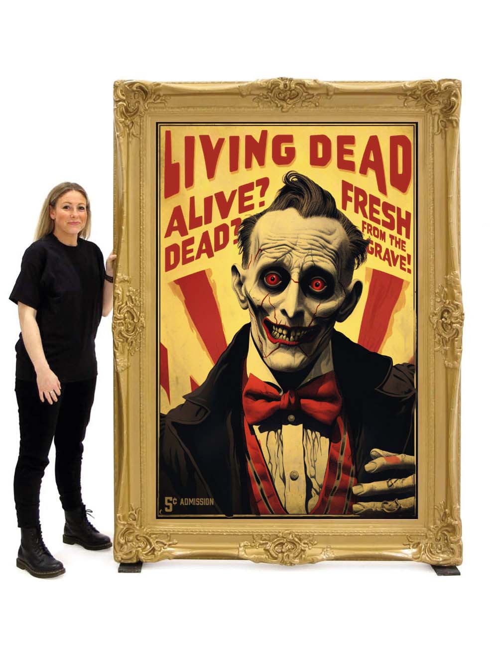 Love Witch Halloween Circus Print in Gold Frame. Great theming for Halloween Circus Freakshow Themed events. Check out the full range of Halloween theme prints in giant frames.