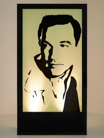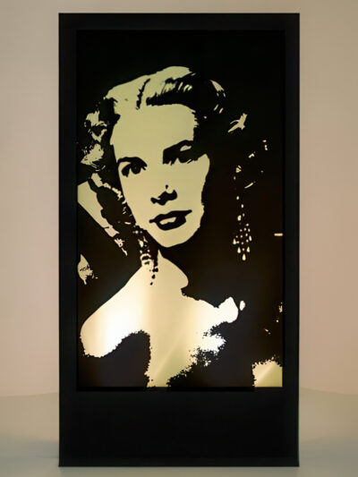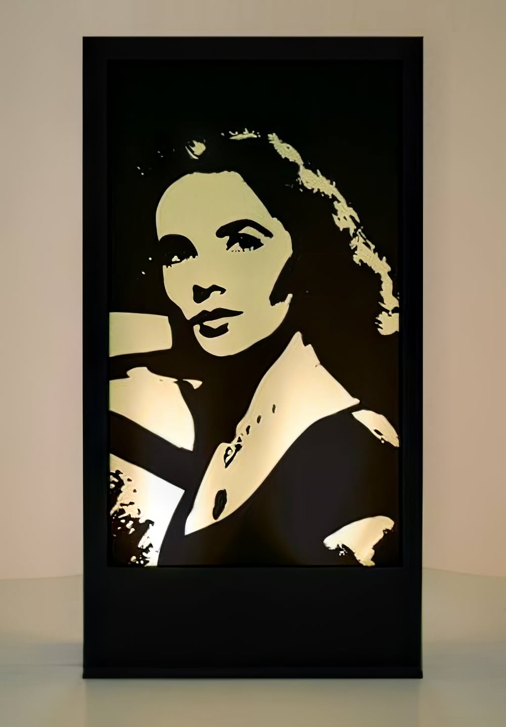 Liz Taylor Silhouette Panel to hire. Depicting Hollywood legend Liz Taylor, this free standing illuminated prop would be perfect lighting prop hire for any Hollywood themed event party. This design is just one of many Hollywood Icon Silhouette Panels. Lighting colour may vary from that shown. All Parcan lights have a 1m lead and it is the responsibility of the client to provide extension leads if longer leads are required.