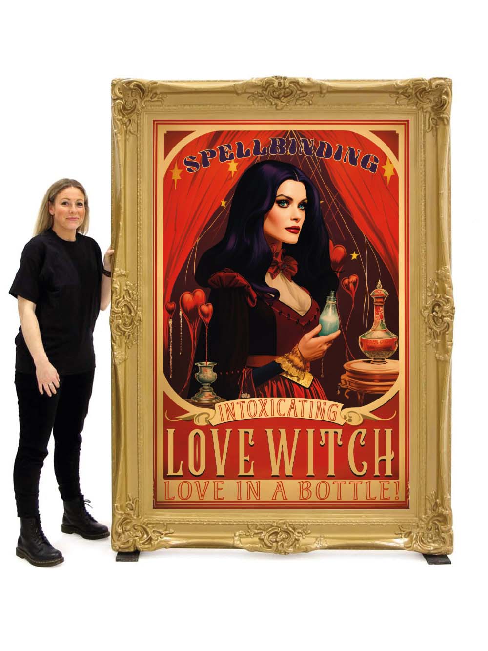 Love Witch Halloween Circus Print in Gold Frame. Great theming for Halloween Circus Freakshow Themed events. Check out the full range of Halloween theme prints in giant frames.