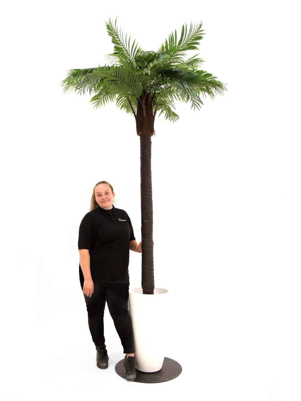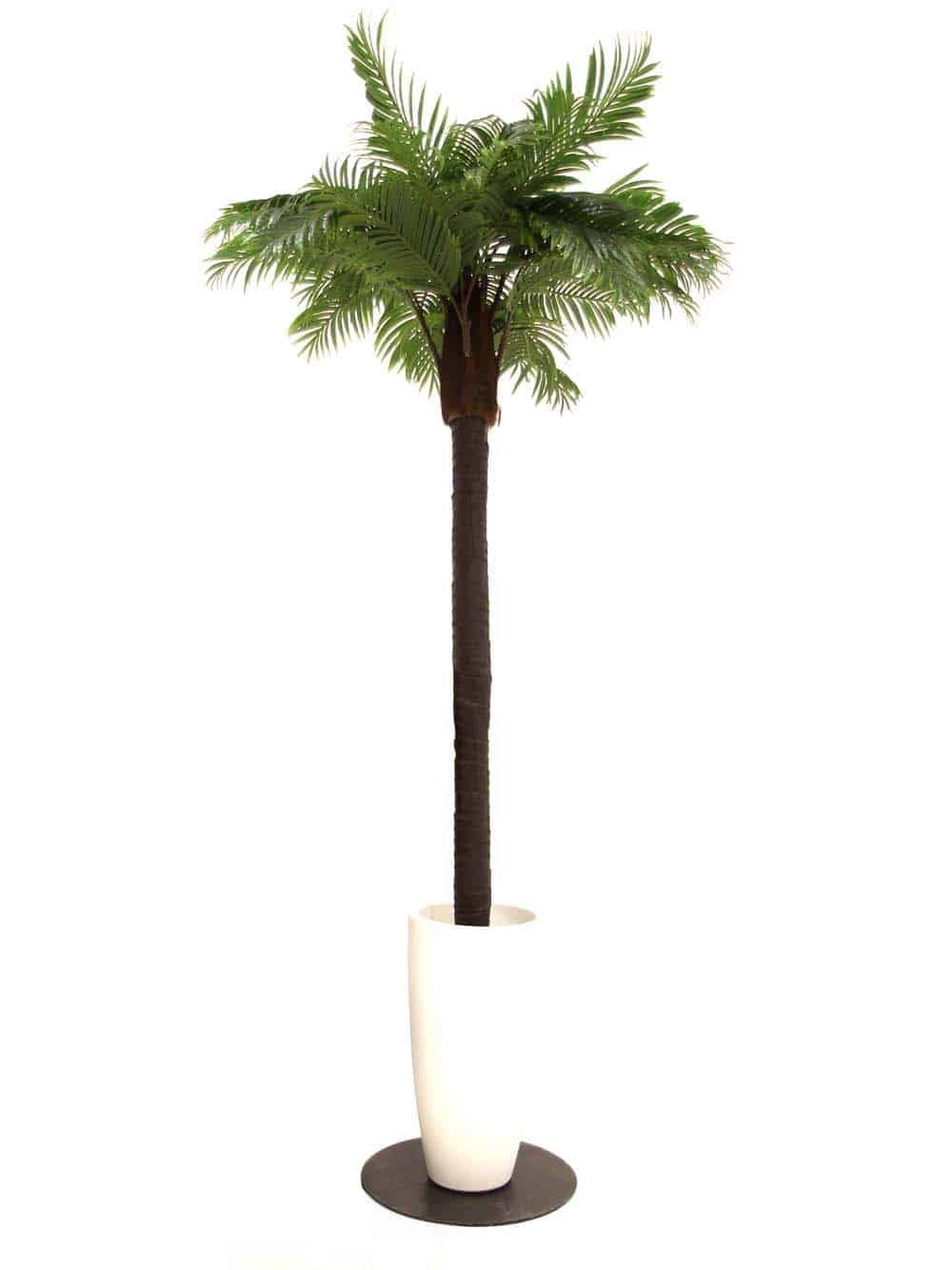 Medium Palm Tree (2.5m) with White Container for hire. Creating the feeling of being on a summer holiday is always a popular option for any event. Our large range of Palm Trees can be used to create all sorts of different looks whether it ย’s a Caribbean beach setting or using them on either side of an entranceway, these super versatile palm trees are a perfect choice. These fantastic in-house designed palm trees are easy to assemble, with quality artificial palm fronds. This palm tree is available at various heights with and without the white container.