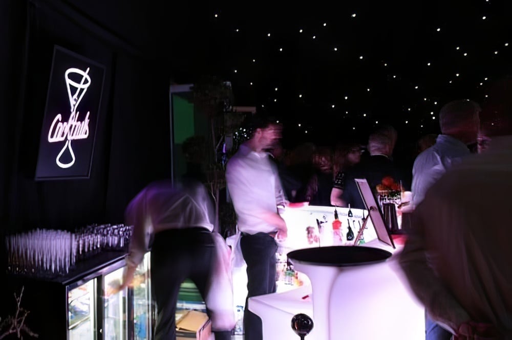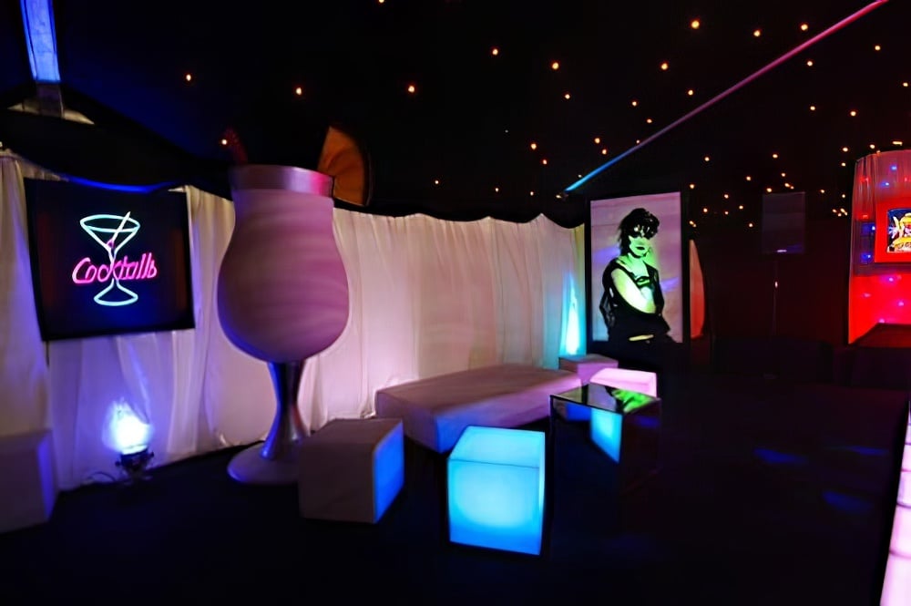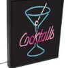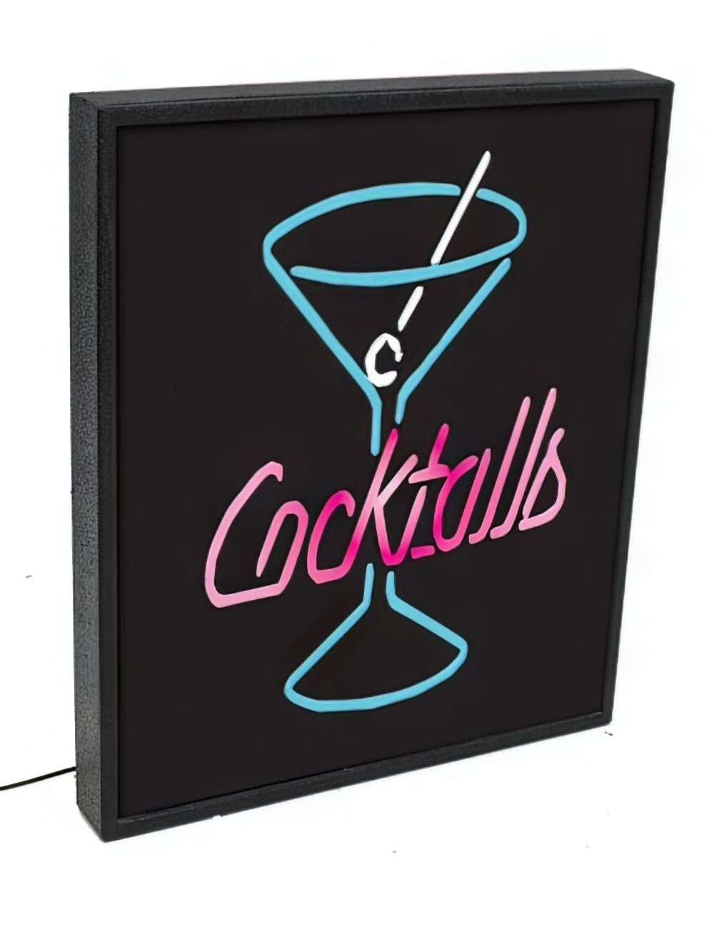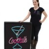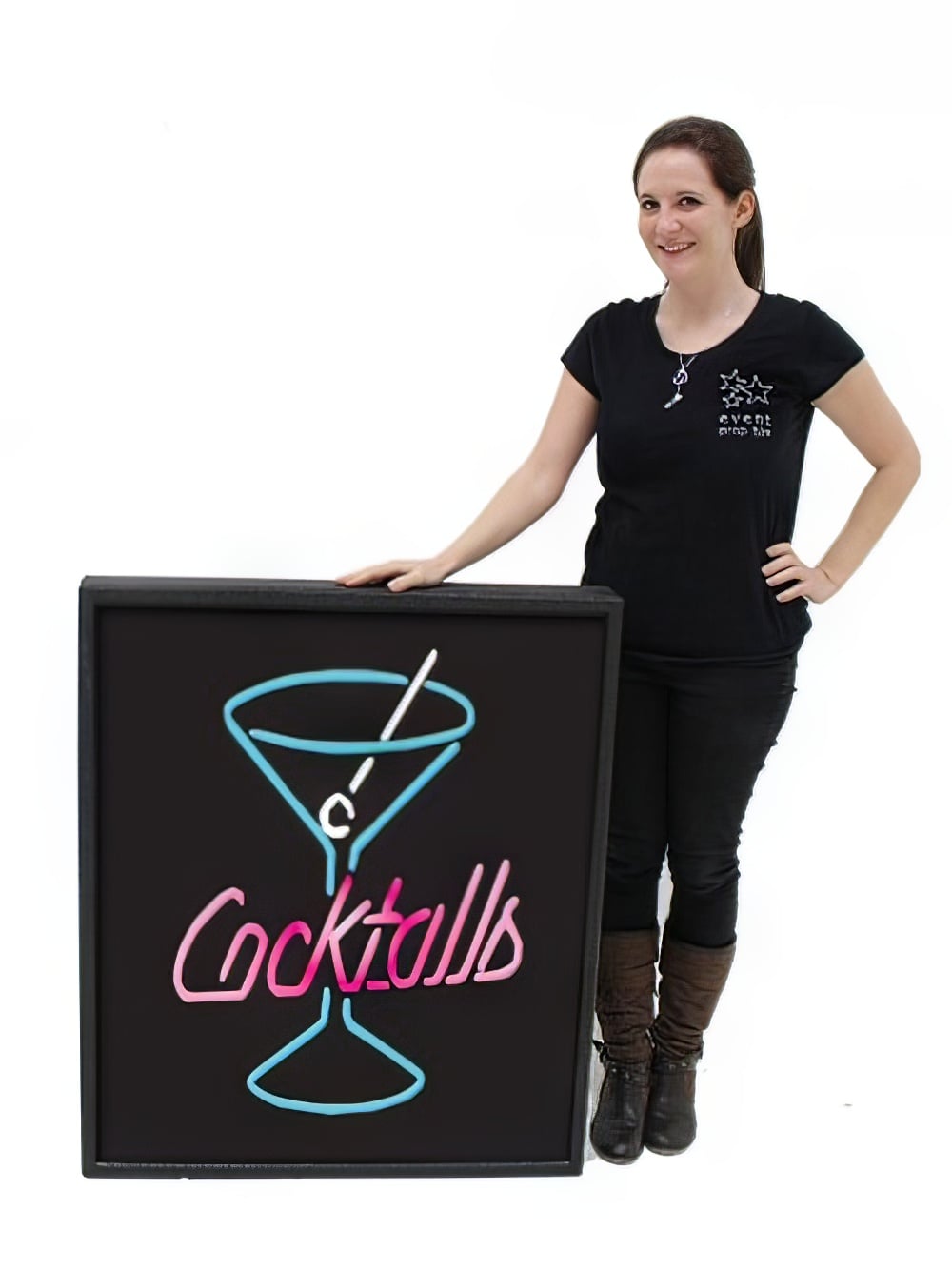 Neon Effect Cocktail Sign to hire. Our neon effect signs have ย internal strip lighting to create a neon tube effect. The signs are mains operated and are fitted with hanging points. The sign is also fully customisable; simply speak to a member of the sales team for details.