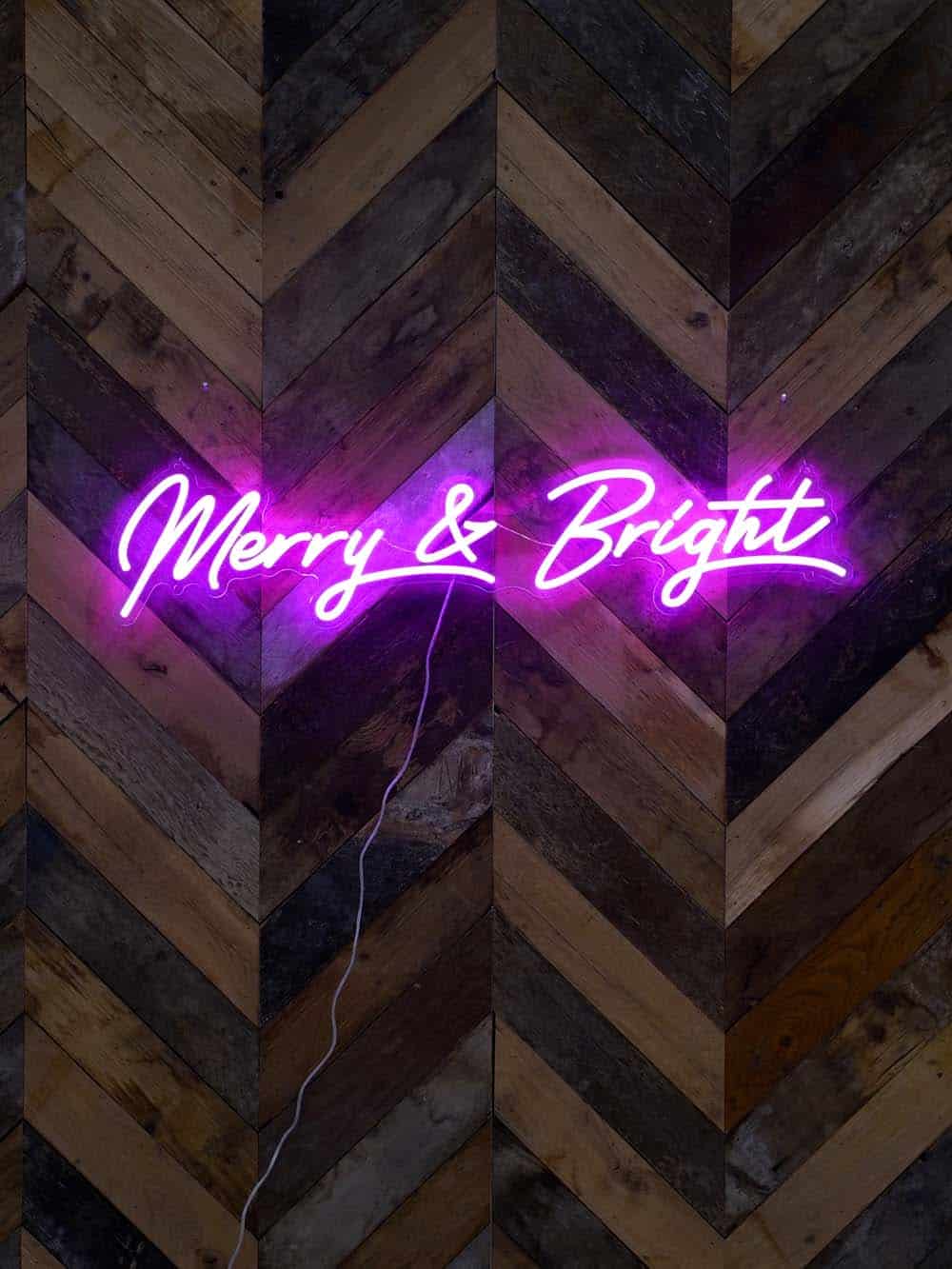 Merry & Bright ย– Neon LED Sign to hire. Our Neon Signs make the perfect addition to your event. Whether you mount them on some of our Living Wall panels, or onto a wooden backdrop ย– they provide a fun bit of lighting and styling.