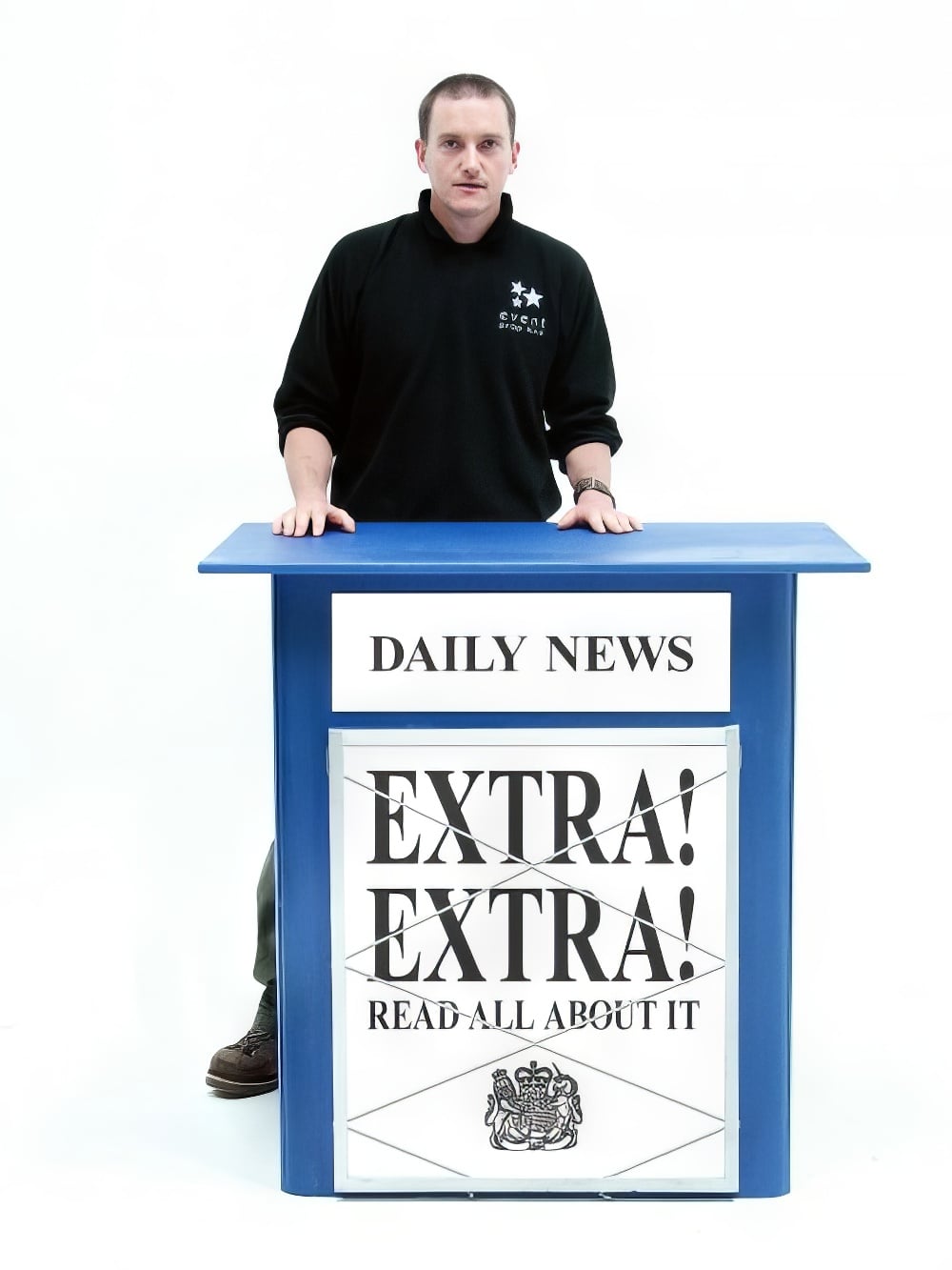 Newspaper Stand for hire. This item will add the final finishing touches to your themed event; the perfect addition to any London or British theming.