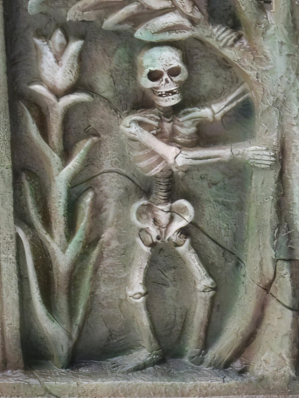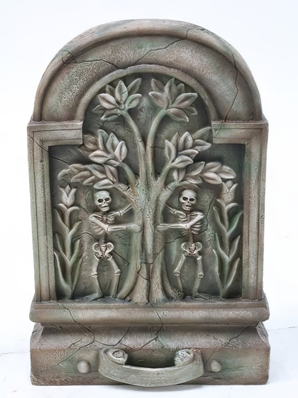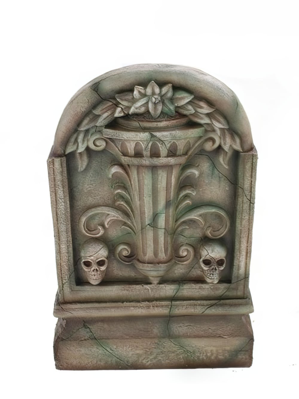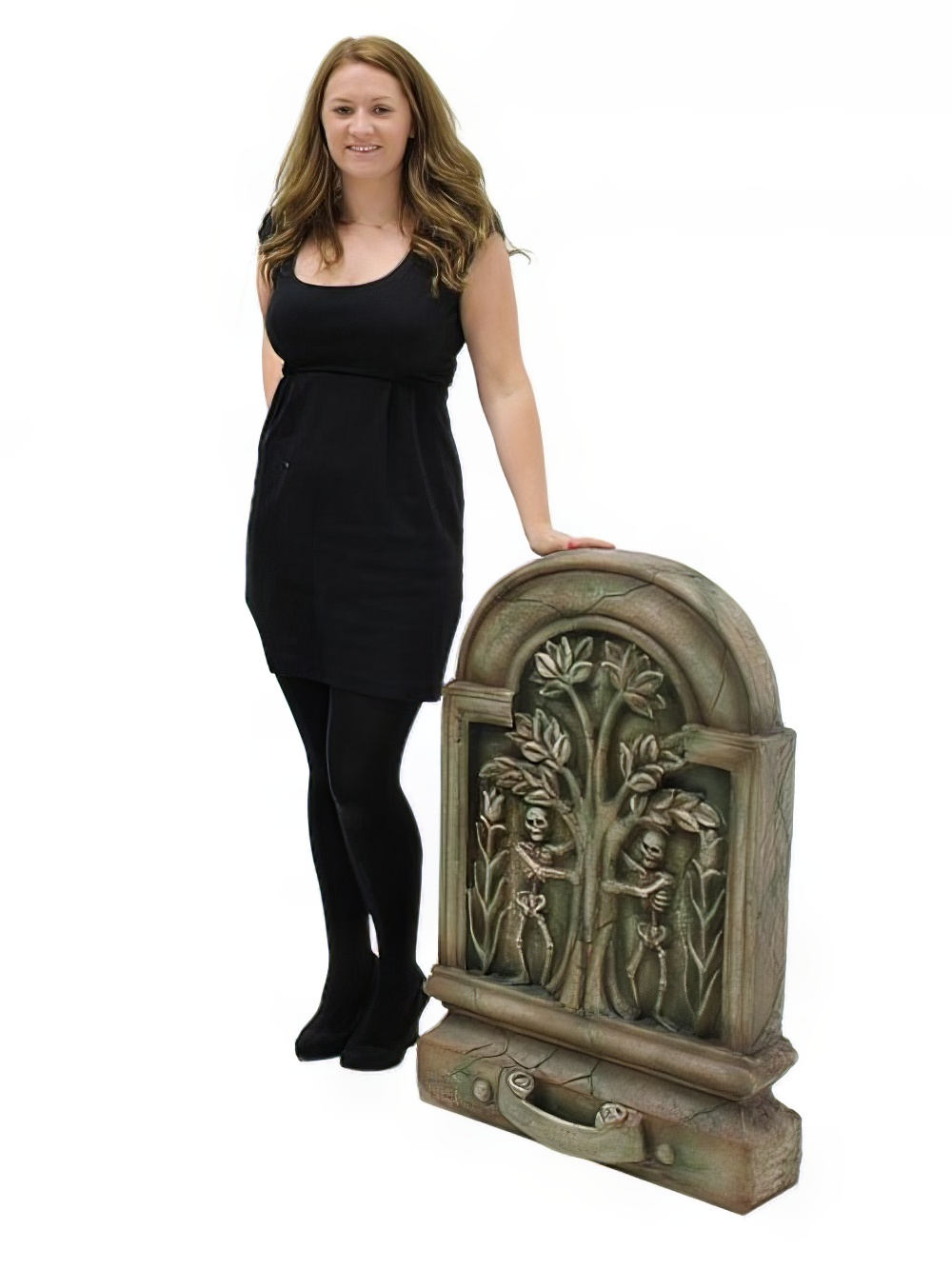 Ornate Headstone to hire. This tombstone is double sided (as shown) and decorated with skulls and skeletons so can be used to great effect at your Halloween or Hell themed event or party to create a spooky graveyard scene!