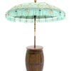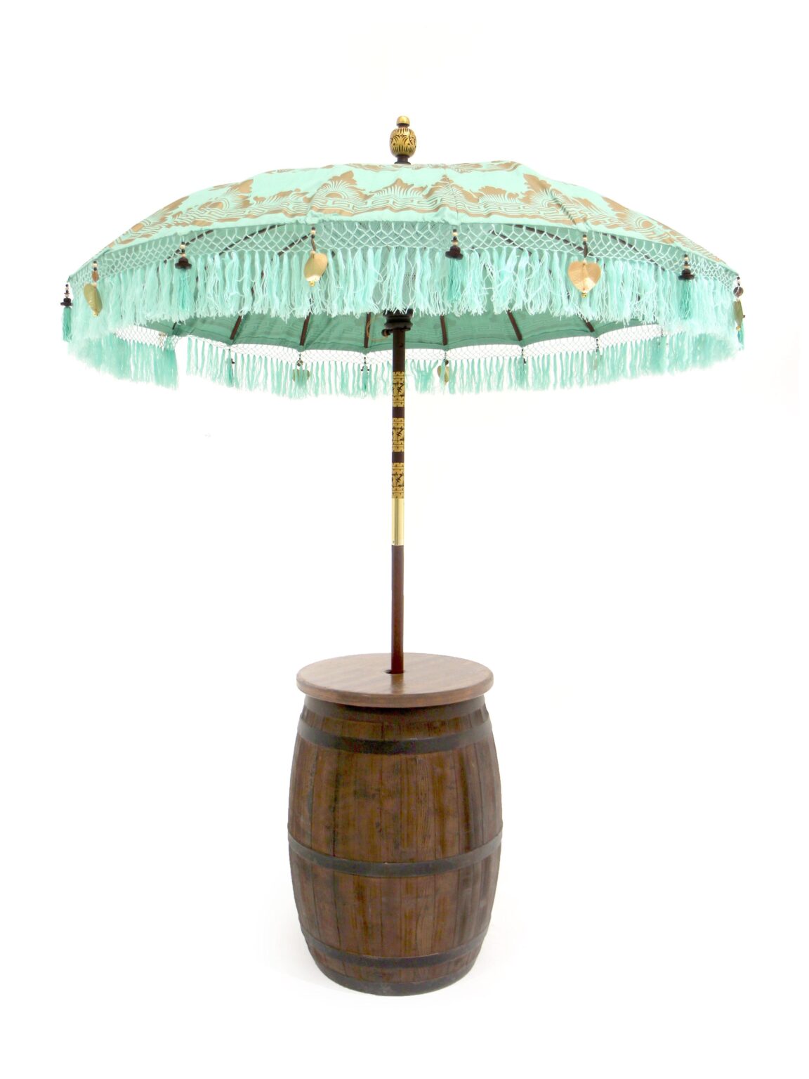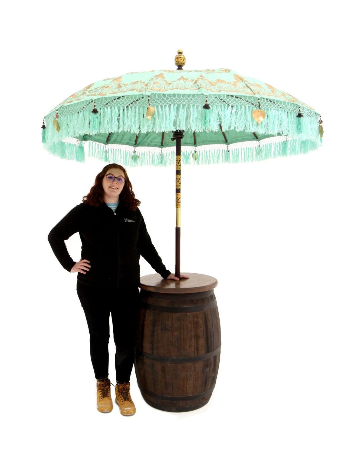 Parasol Poseur Table to hire. This chic, Balinese style parasol makes the perfect addition to our wood effect barrel poseur table.