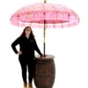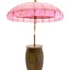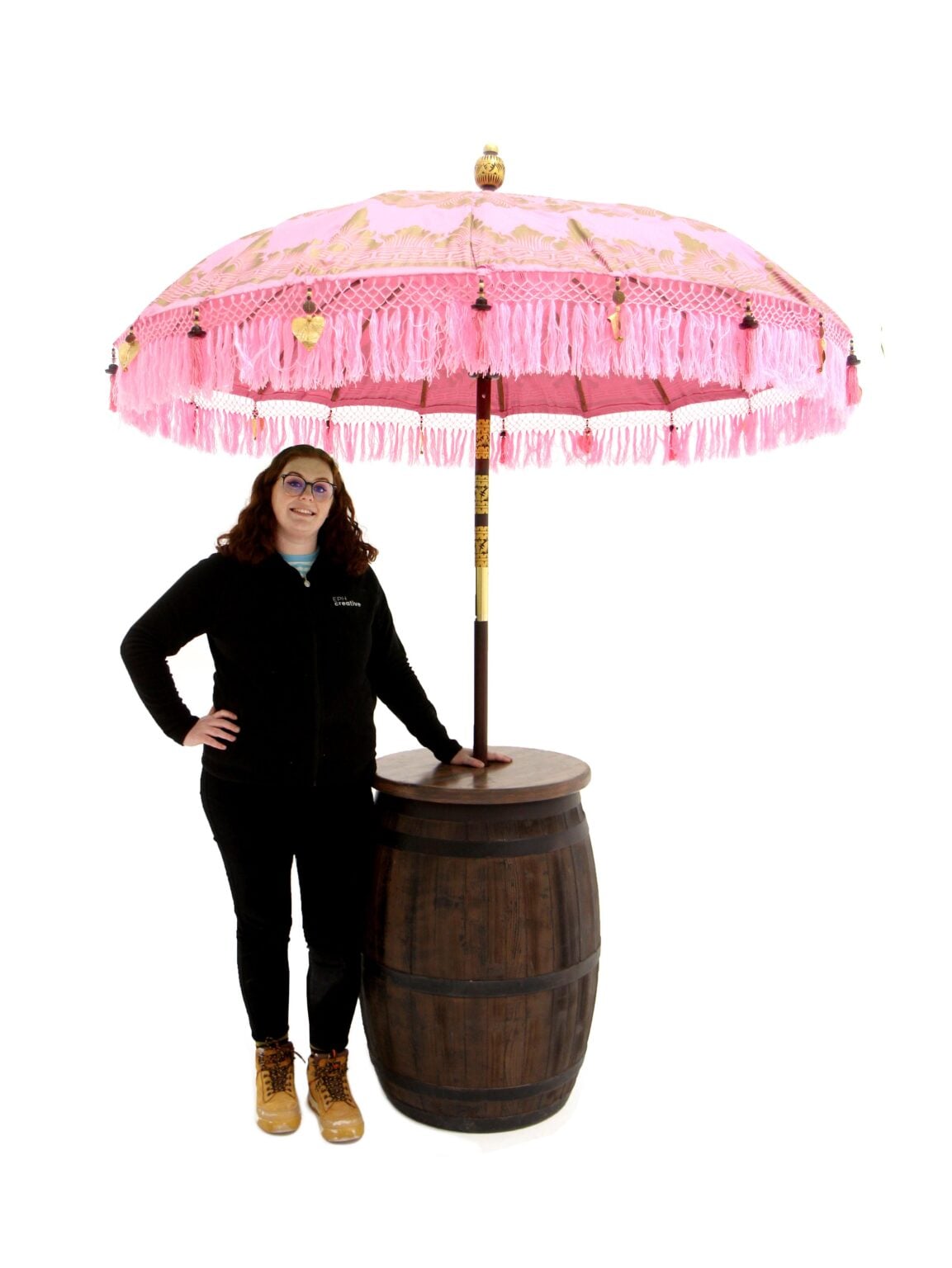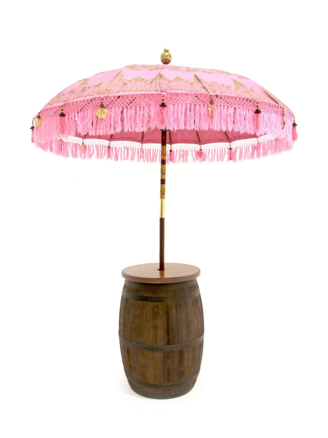 Parasol Poseur Table to hire. This chic, Balinese style parasol makes the perfect addition to our wood effect barrel poseur table.