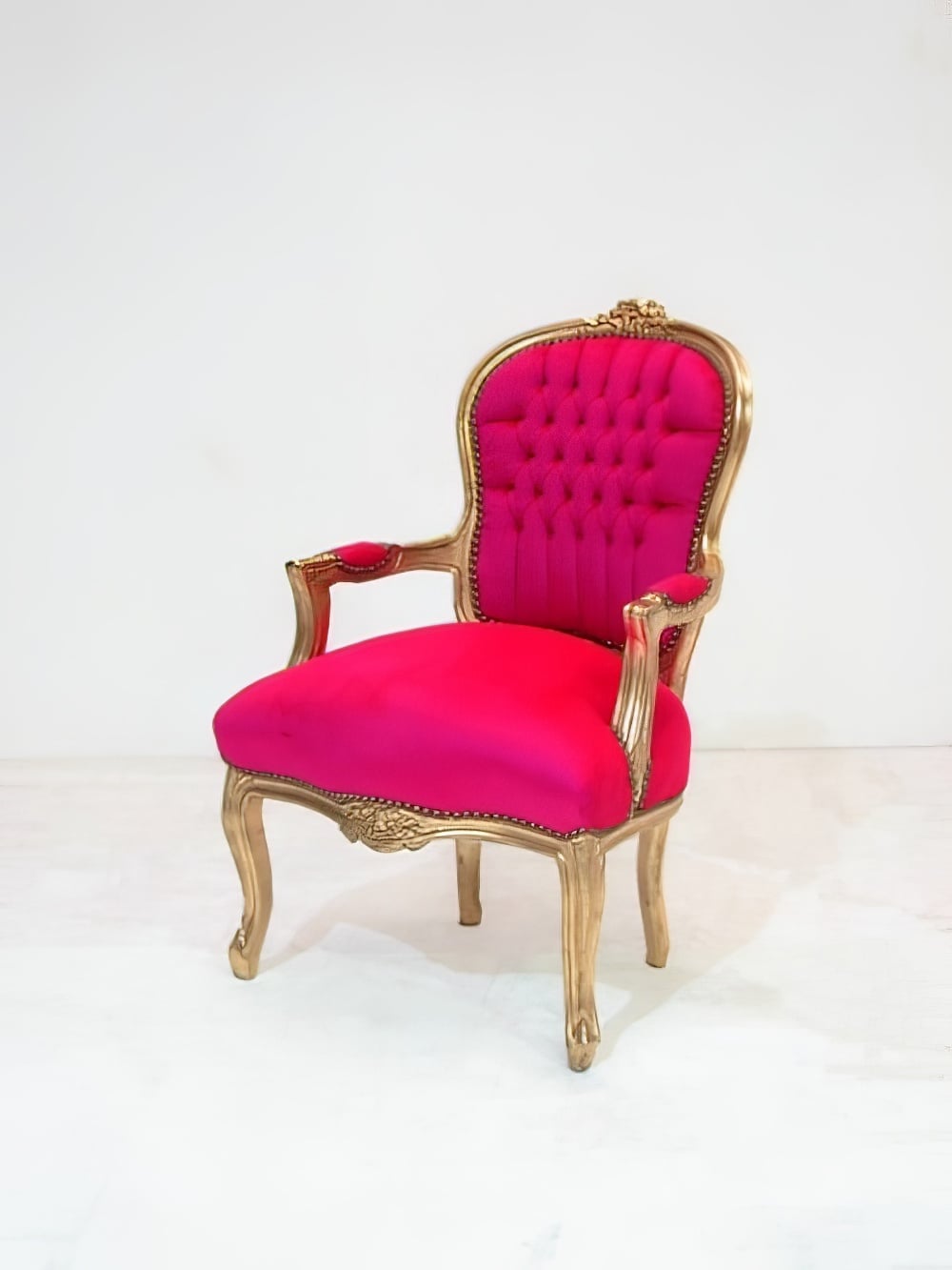 Pink Upholstered Chair for hire. This lovely throne-style chair is perfect for any little princess at her birthday party. Also suitable for Alice in Wonderland, Fairytale, Barbie and a whole host of other themed events or parties!