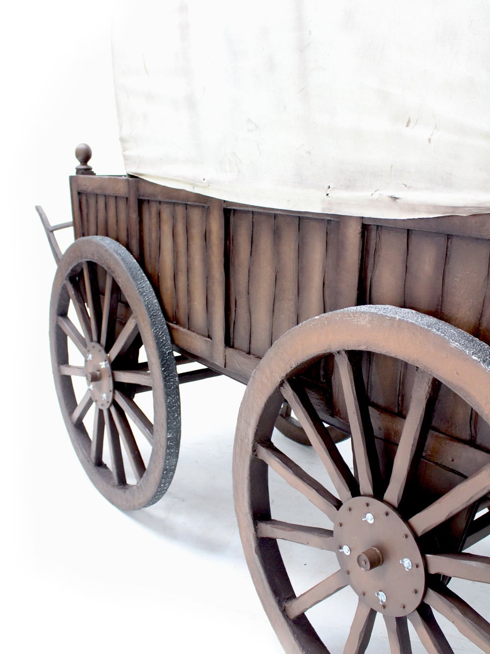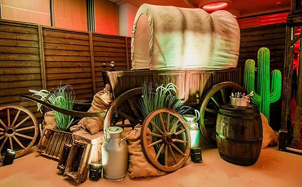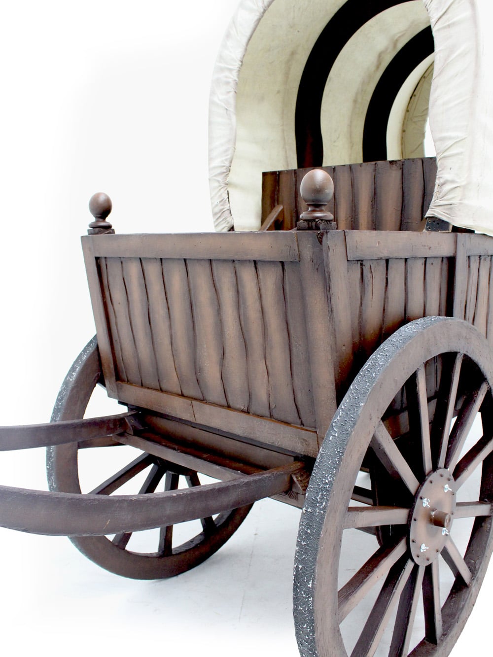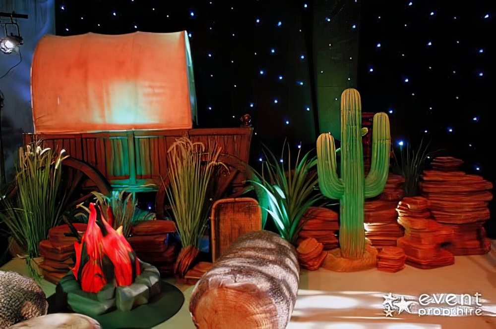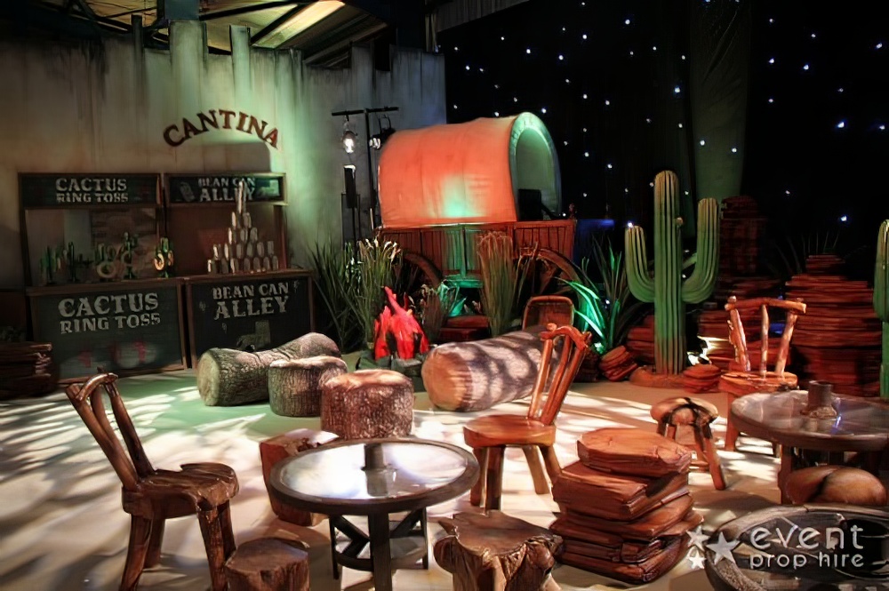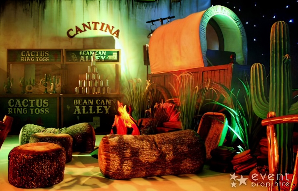 Pioneer Wagon for hire. This is a fantastic showpiece prop, which will really add a touch of authenticity to your Wild West themed event. Use alongside our Ranch Entranceway, Western Front or other Wild West themed props (pictured below) for that extra theming impact! And for something a little different…the wagon top can come off so if you want to hire it without the top then simply quote prop code ย SN1495.
