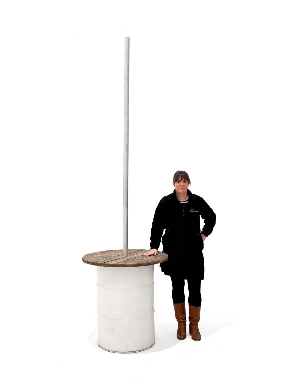Poseur Table Bunting Unit – White Steel Drum with Pole (3m) to hire.