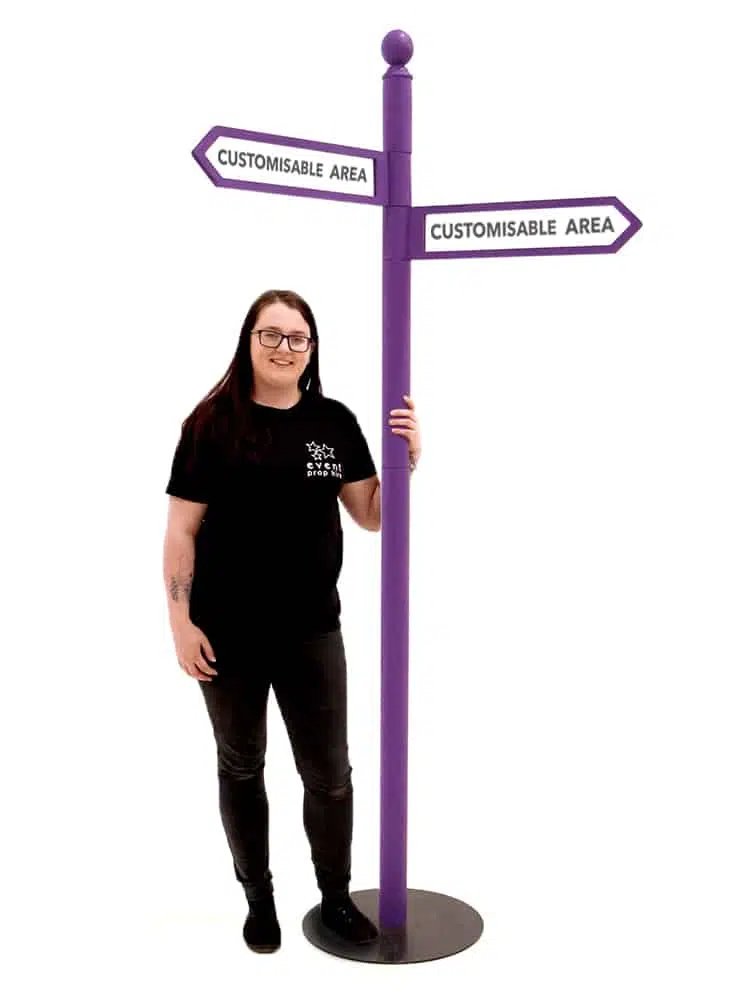 Purple Multi-Directional Sign Post to hire. This signpost is very cleverly designed so that the directional arms can be rotated to point in different directions; allowing you full flexibility to highlight different ย locations within your themed event. Also available with just 4 or 6 rotating signs and in other colours. The cost quoted includes the ย customisation ย of the ย double-sided directional arms. This consists of a vinyl print on foamex which simply slips into the frame of the directional arm. We can create the customised artwork for your event. We have a highly skilled team of graphic designers who can help you with the customisation of our directional signposts. We can design customised graphics to suit your event theme. ย Contact us for more details. ย Alternatively you can customise this product yourself then we can take care of the printing for you, we just need your artwork. Alternatively you can customise this product yourself then we can take care of the printing for you, we just need your artwork.